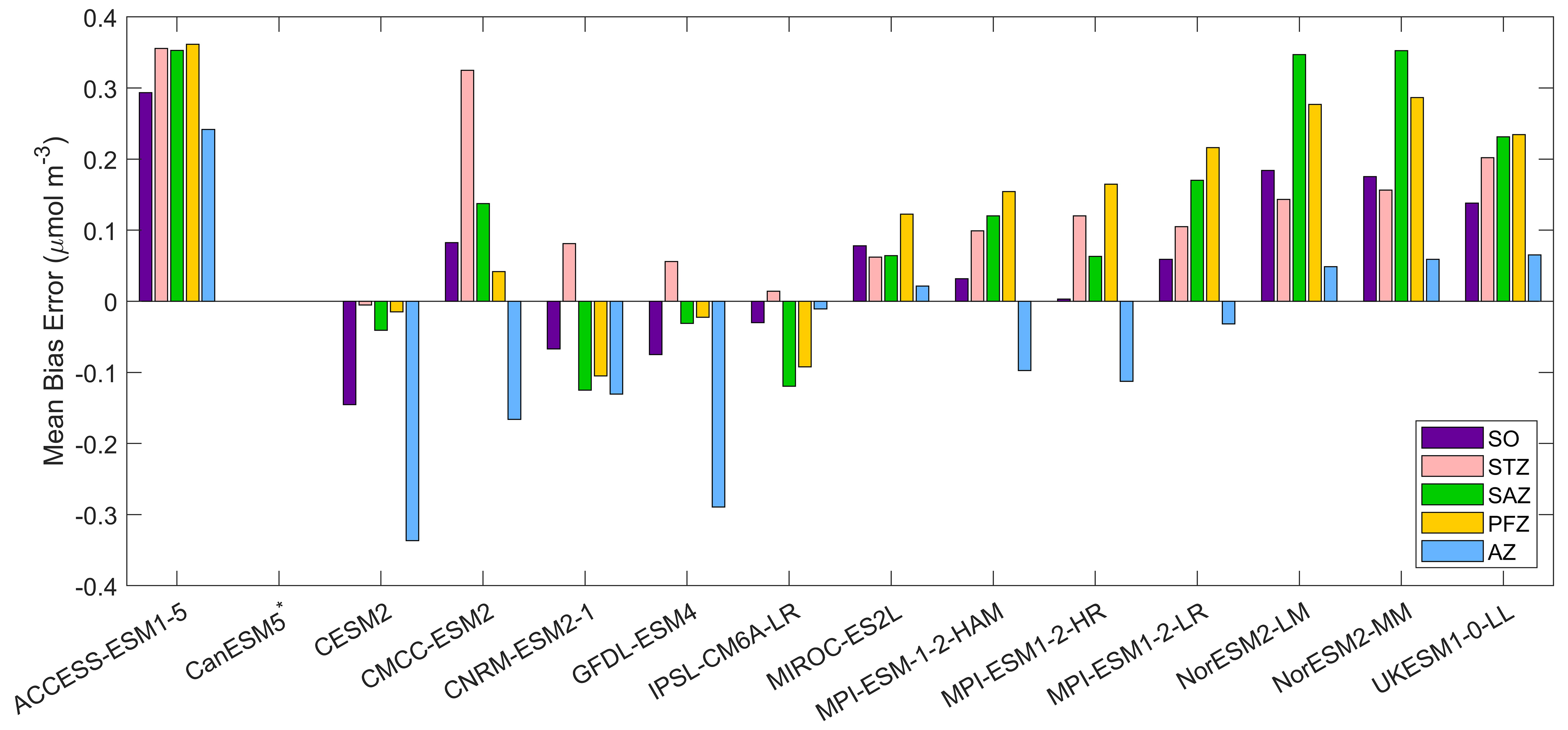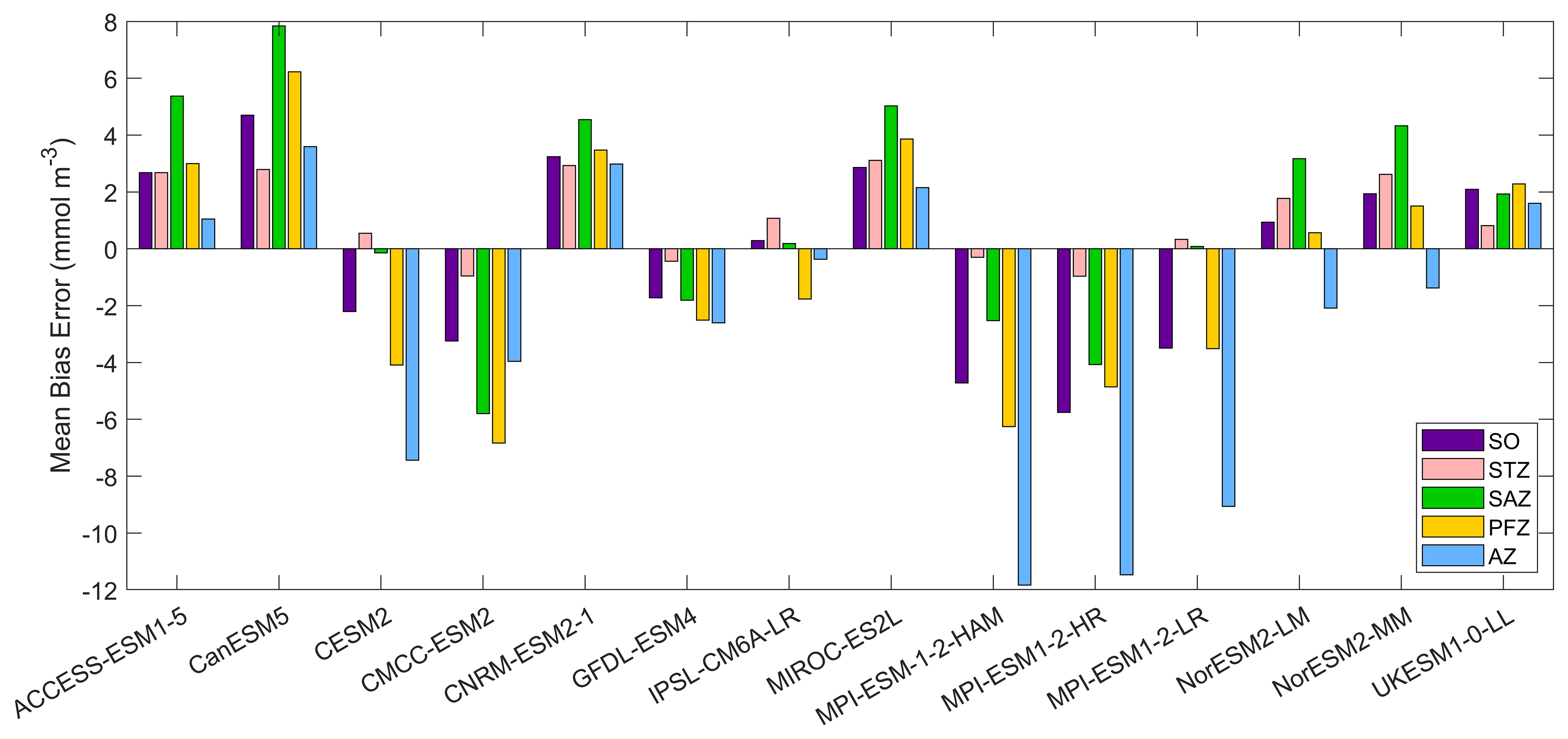 Figure 4The mean bias errors in surface nitrate concentrations for the Southern Ocean (SO), the subtropical zone (STZ), the subantarctic zone (SAZ), the polar front zone (PFZ), and the Antarctic zone (AZ) in DJF.