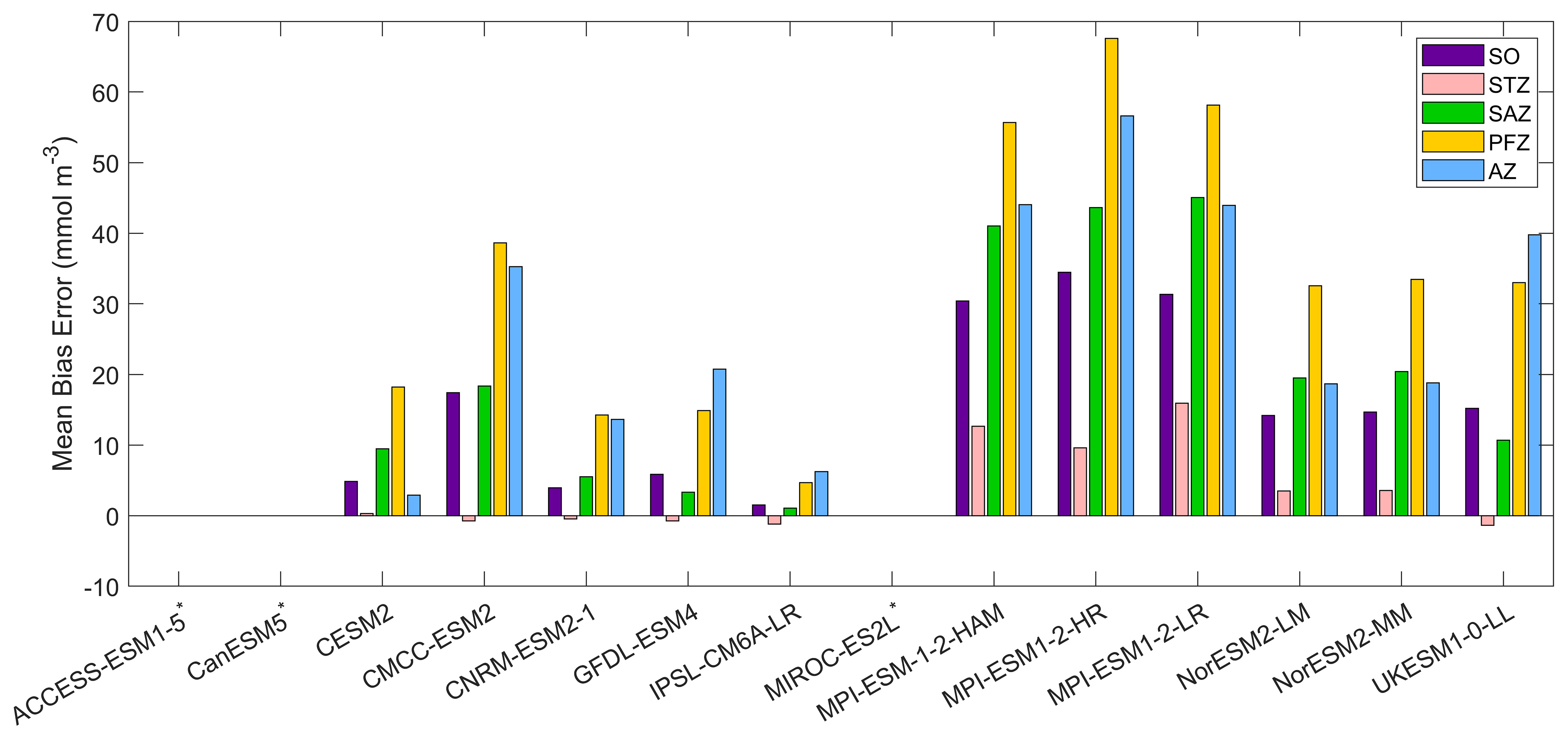 Figure 6The mean bias errors in surface silicate concentrations for the Southern Ocean (SO), the subtropical zone (STZ), the subantarctic zone (SAZ), the polar front zone (PFZ), and the Antarctic zone (AZ) in DJF. Models with unavailable silicate are labelled with *.