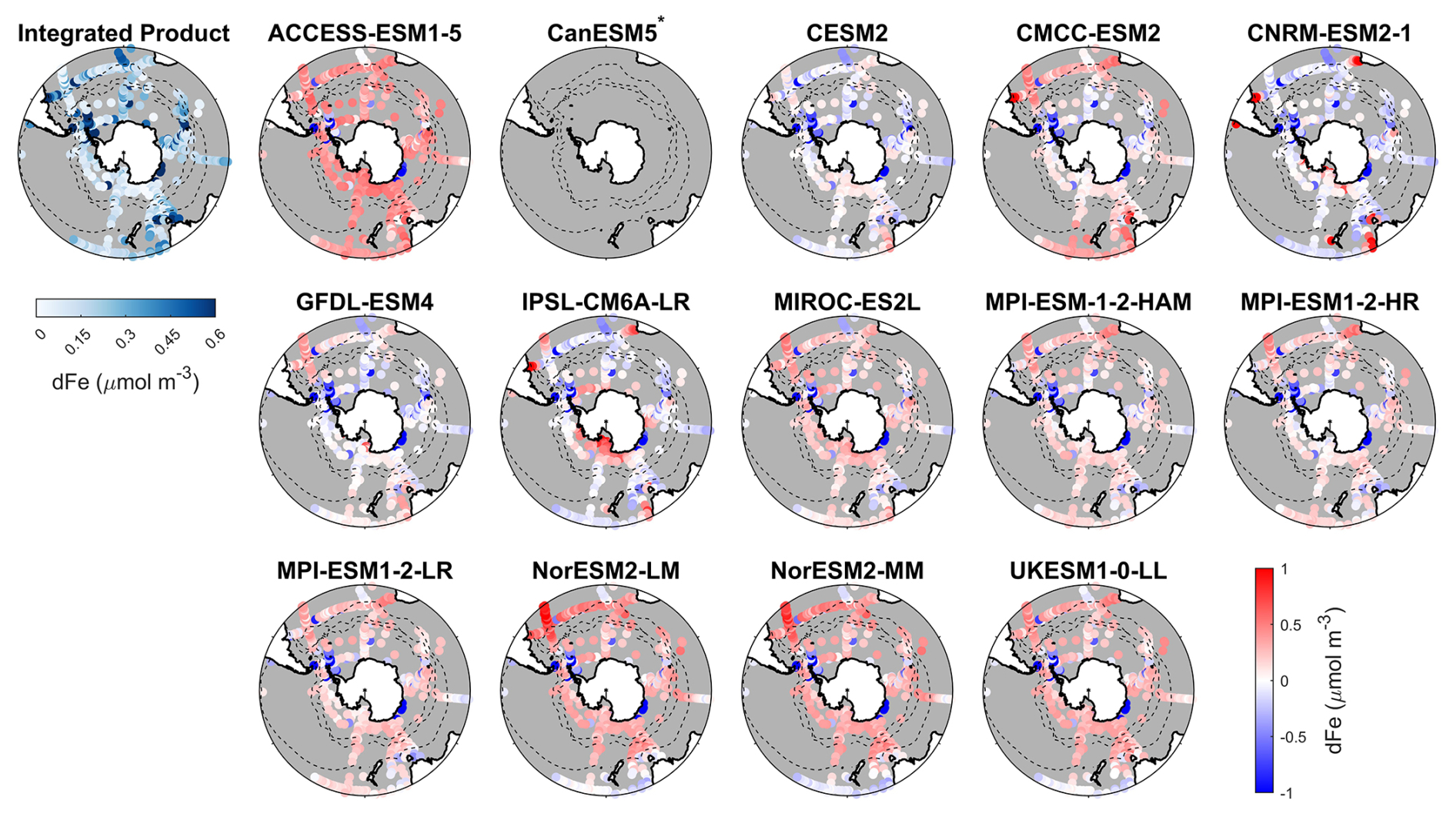 Figure 7Observed surface dissolved iron concentrations from an integrated product by GEOTRACES IDP2021v2 and Tagliabue et al. (2012), and spatial biases of surface dissolved iron concentrations for 14 CMIP6 models (model dissolved iron – observed dissolved iron) for the Southern Ocean (>30° S). Models with unavailable dissolved iron are labelled with *.