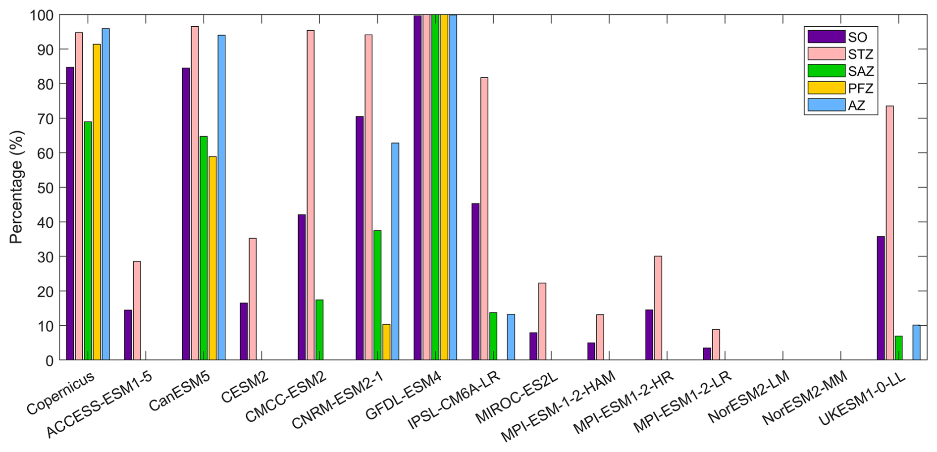 Figure 10The percentage of DCM occurrence in the Southern Ocean (SO), the subtropical zone (STZ), the subantarctic zone (SAZ), the polar front zone (PFZ), and the Antarctic zone (AZ) in DJF. All percentages in each region are calculated using area-weighted averages.