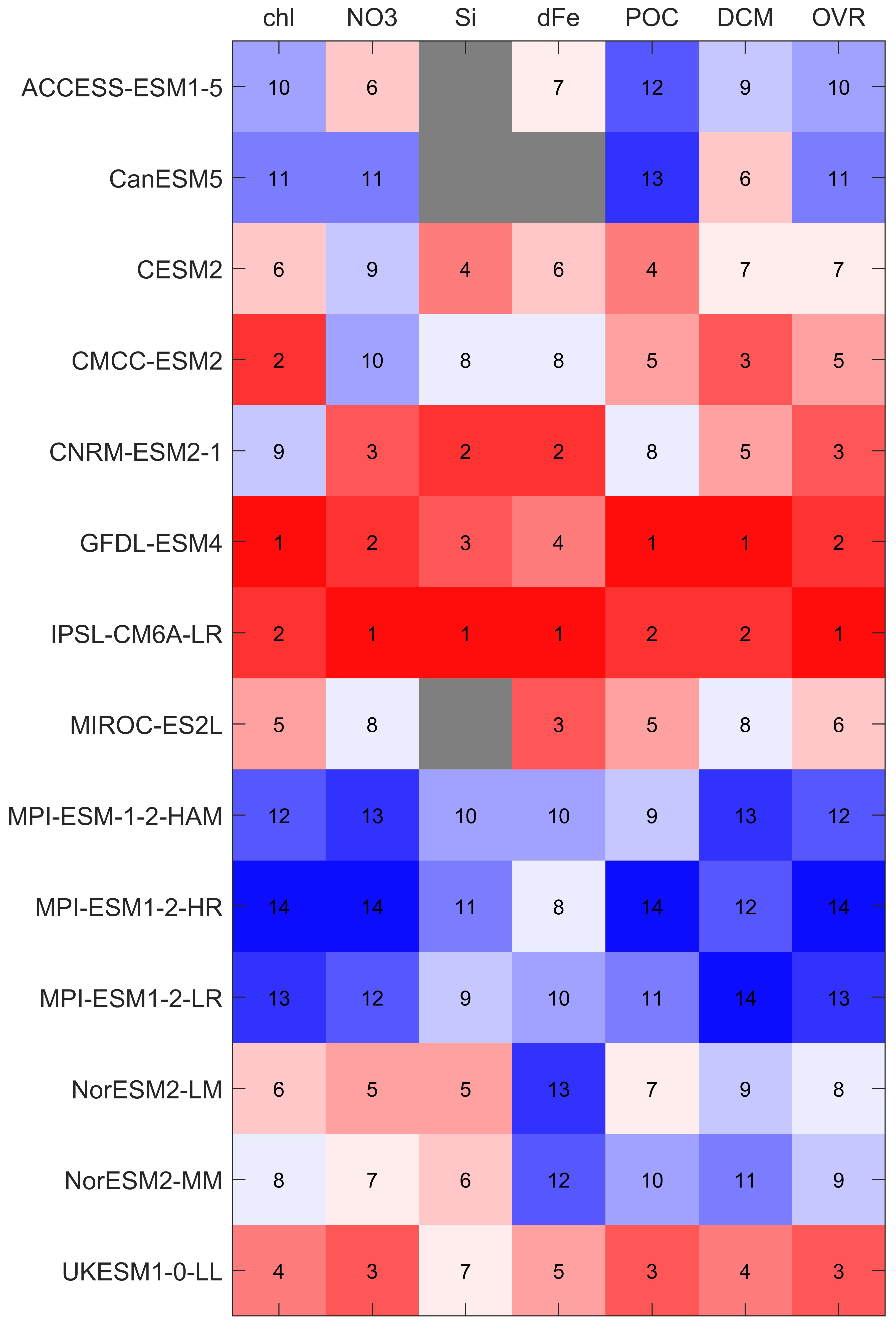 Figure 13Heatmap of performance ranks for 12 CMIP6 models. Columns list the evaluated variables – surface chlorophyll (Chl), nitrate (NO3), silicate (Si), dissolved iron (dFe), particulate organic carbon (POC), deep chlorophyll maximum metrics (DCM) – and an overall score (OVR). Rows list the models. Box colours and overlaid numbers give the rank for each model–variable pair (1= best, higher numbers = poorer performance): reds indicate higher ranks, blues lower ranks, and grey boxes indicate variables not available for that model.