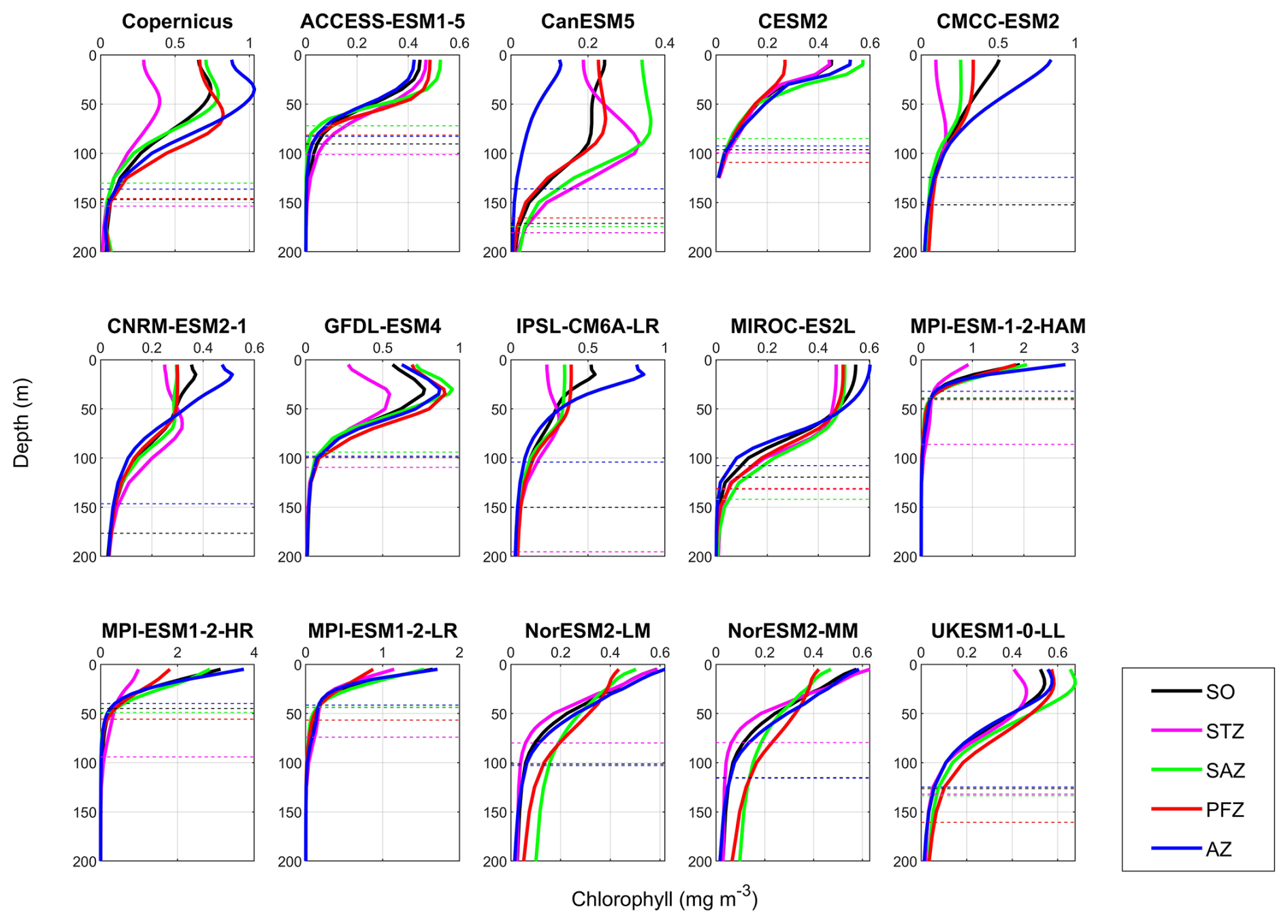 Figure 14Mean vertical profiles of chlorophyll during DJF (December–January–February) across the Southern Ocean (SO) and its subregions: the Subtropical Zone (STZ), Subantarctic Zone (SAZ), Polar Frontal Zone (PFZ), and Antarctic Zone (AZ), based on observations (Copernicus) and 14 CMIP6 models. Solid lines represent chlorophyll profiles in different regions, while dashed lines indicate the threshold depth of chlorophyll, defined as the depth at which chlorophyll concentration reaches 10 % of the maximum value.