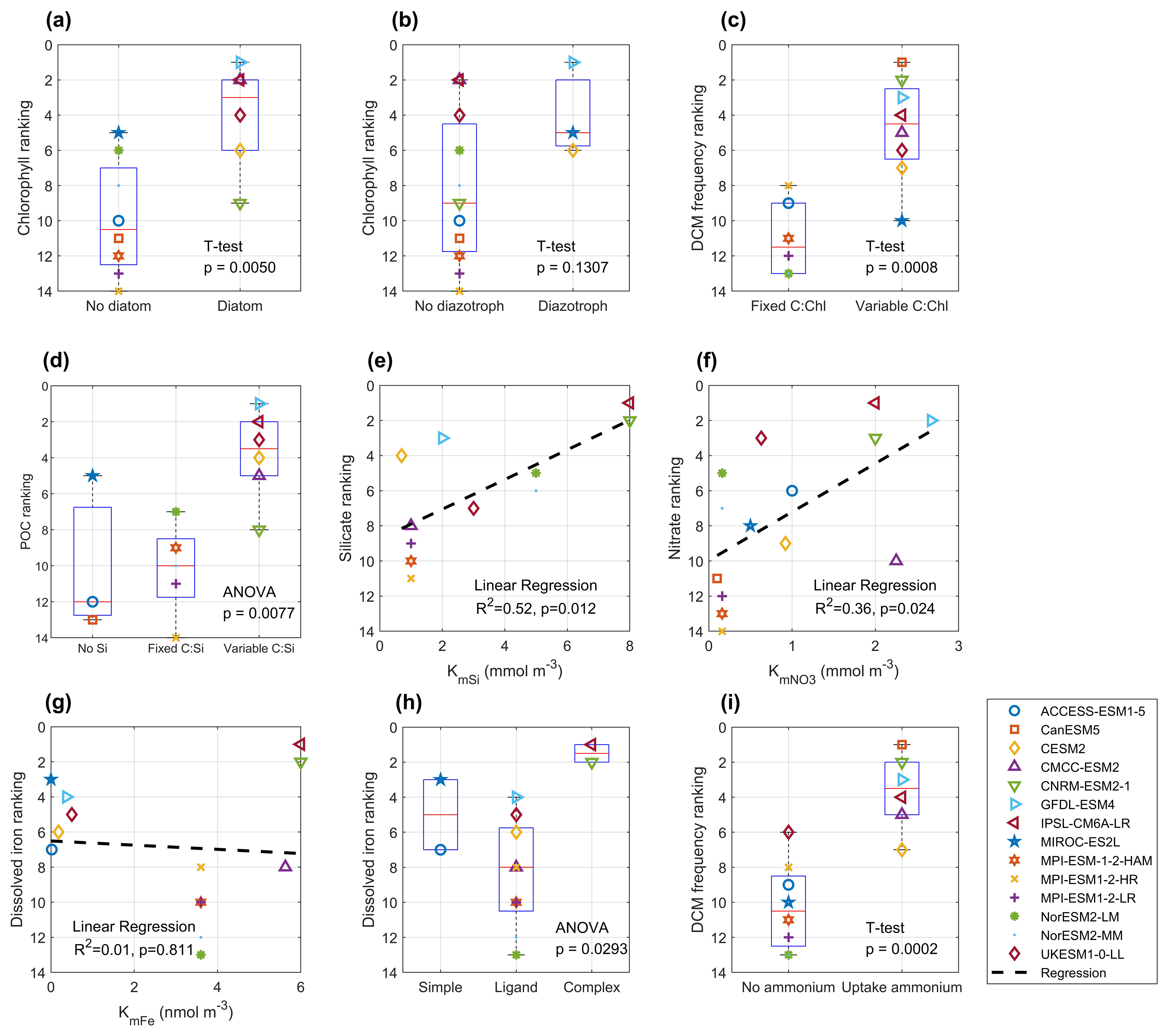 Figure 15Panels show statistical relationships between model rankings and key biogeochemical descriptors: (a) surface chlorophyll ranking vs. inclusion of diatom; (b) surface chlorophyll ranking vs. inclusion of diazotroph; (c) DCM frequency ranking vs. use of a variable C : Chl ratio; (d) POC ranking vs. presentation of silica cycling (presence of an explicit Si pool or variable C : Si ratio); (e) silicate ranking vs silicate half-saturation coefficient (KmSi); (f) nitrate ranking vs. nitrate half-saturation coefficient (); (g) dissolved iron ranking vs. iron half-saturation coefficient (KmFe); (h) dissolved iron ranking vs. iron chemistry complexity (simple-no ligand, simple ligand, or complex ligand scheme); (i) DCM frequency ranking vs model ability to assimilate ammonium for photosynthesis. (a), (b), (c), (i) are performed using T-test, (d) and (h) are performed using ANOVA (Analysis of Variance), (e), (f), (g) are performed using linear regression. Tests applied: two-sample t-tests for (a), (b), (c), (i); one-way ANOVA for (d), (h); linear regression for (e)–(g). Each point (colour/shape) represents a CMIP6 model, and dashed lines indicate regression fits where relevant. Corresponding P-values and R2 statistics (for regressions) are displayed on each panel.