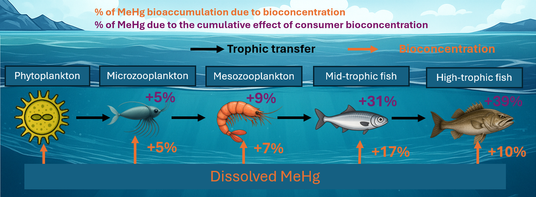 The mercury (Hg) form of most concern is monomethylmercury (MMHg⁺) due to its neurotoxicity and ability to bioaccumulate in seafood. Bioaccumulation in seafood occurs via bioconcentration (direct uptake) and biomagnification (trophic transfer). Our study separates these processes, showing that bioconcentration increases MMHg⁺ in high trophic level fish by 15 % per level, contributing 28–49 % of MMHg⁺ in Atlantic cod. These findings can be used to inform efficient Hg modeling strategies.