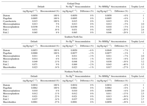 The model output is shown in Table 1. All results are derived from model simulations. To quantify the influence of consumer-level bioconcentration and bioaccumulation of Hg2+ on MMHg+ bioaccumulation, the model was run under scenarios with and without bioaccumulation of Hg2+ and with and without consumer-level bioconcentration of MMHg+. The  % bioconcentrated is calculated as Bioconcentrated (%)=BioconcentratedBioaccumulated100% and the difference (%) is calculated as Difference (%)=ScenarioDefault100. The italic values in the difference category indicate when the scenario causes a change larger than 10 %. The values are based on the last 10 years of the simulation and the top 20 m of the water column, to create an average value that we can compare between the setups.
