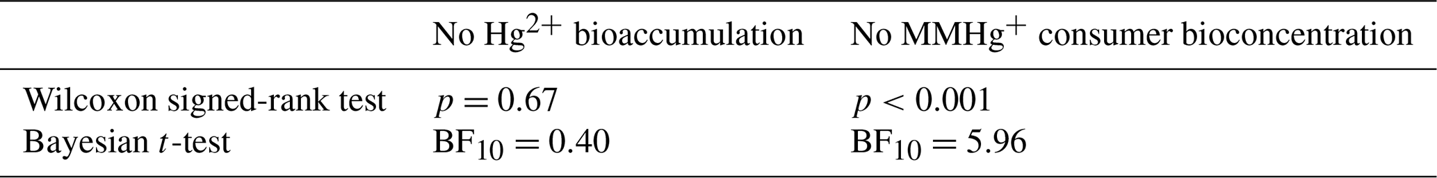 The effect of Hg2+ bioaccumulation on the bioaccumulation of MMHg+ is shown in Table 1. To quantify the influence of consumer-level bioconcentration and bioaccumulation of Hg2+ on MMHg+ bioaccumulation, the model was run under scenarios with and without bioaccumulation of Hg2+ and with and without consumer-level bioconcentration of MMHg+. The differences are low between 1 % and 6 %. This is statistically evaluated, and the results are shown in Table 2. Wilcoxon's signed rank test shows that bioaccumulation of Hg2+ has no significant impact on the bioaccumulation of MMHg+ (p=0.67). Furthermore, the Bayesian t-test shows with a BF10=0.40 that the results are 2.5 times more likely under the null hypothesis of no effect than under the alternative hypothesis.