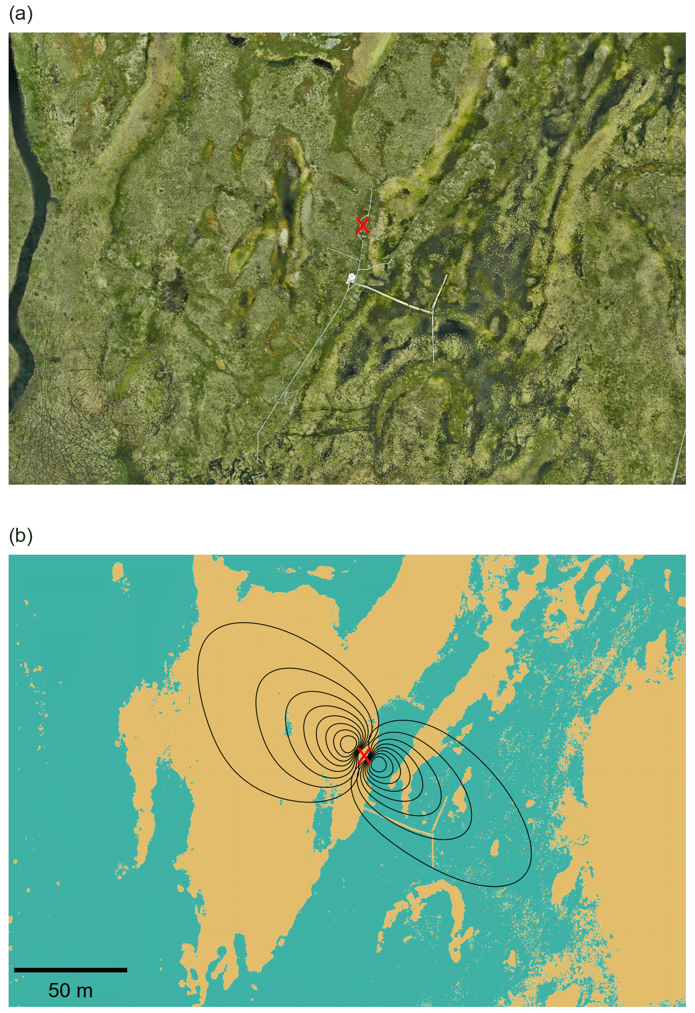 Figure 1(a) Red–green–blue (RGB) orthomosaic of the Stordalen peatland from an unoccupied aerial vehicle (UAV) flight on 12 June 2024 and (b) the surface map derived from the digital elevation map (DEM) and flux footprints in the northwest (NW) and southeast (SE) directions. Black lines represent flux footprint contours from 10 % to 80 %, and the location of the EC tower is marked by a red cross. The yellow colour indicates the dry surface and the turquoise colour the wet surface. UAV data were provided by the Swedish Infrastructure for Ecosystem Science (SITES) under a CC BY 4.0 license; the red cross was added by the authors.