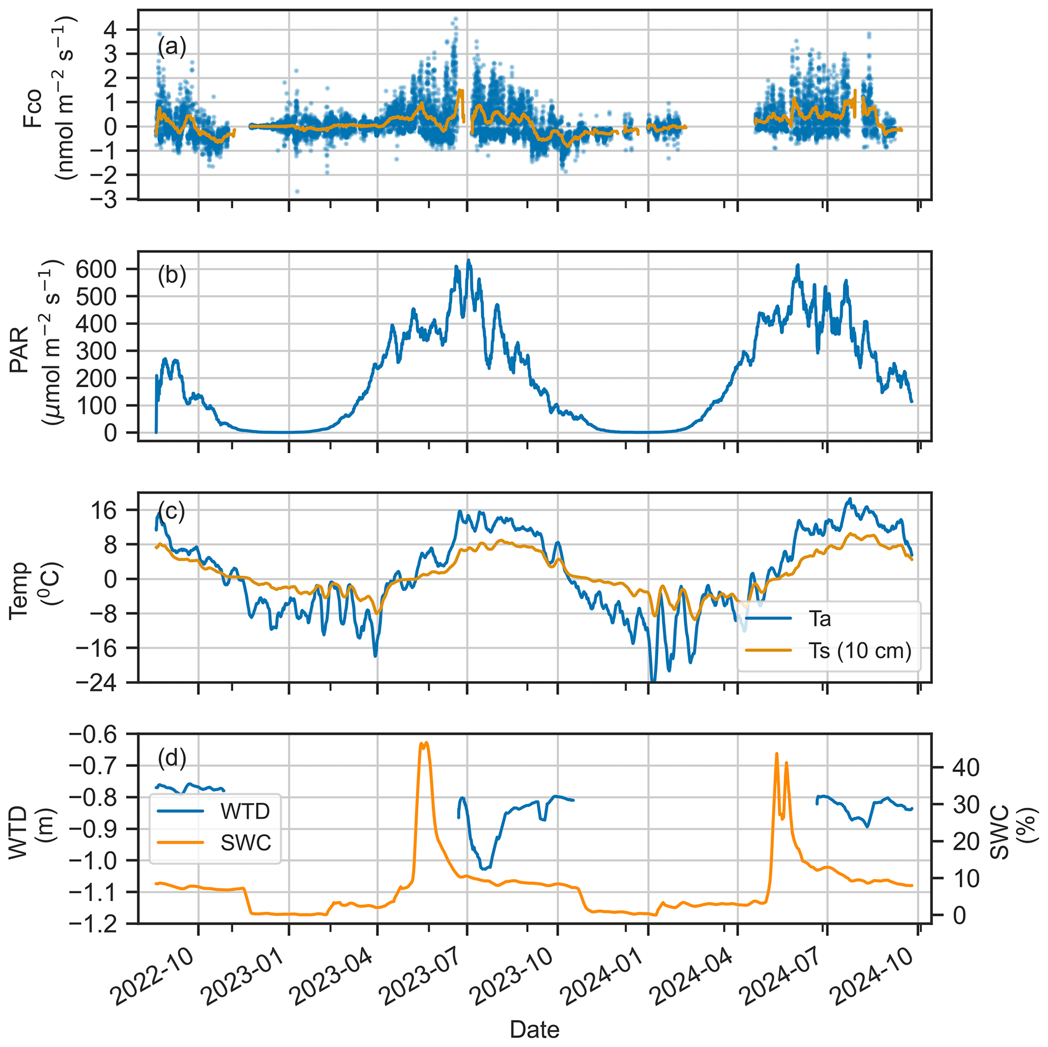 Figure 2Time series of (a) CO flux, (b) photosynthetically active radiation (PAR), (c) air temperature (Ta) and soil temperature at 10 cm depth (Ts), and (d) water table depth (WTD) and soil water content (SWC) at 10 cm depth. The solid line represents the 7 d rolling average (a–d), and the dots indicate half-hourly flux (a).