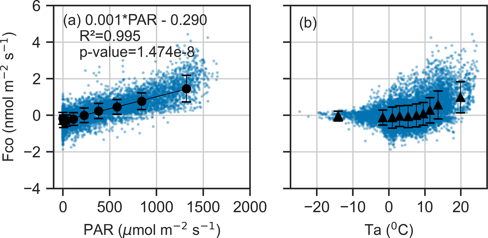 Figure 5Binned mean and standard deviation between CO flux and (a) photosynthetically active radiation (PAR) and (b) air temperature (Ta) during March–November. The data are divided into 10 equally sized bins, and blue dots represent the 30 min fluxes. A linear regression line is fitted to PAR.