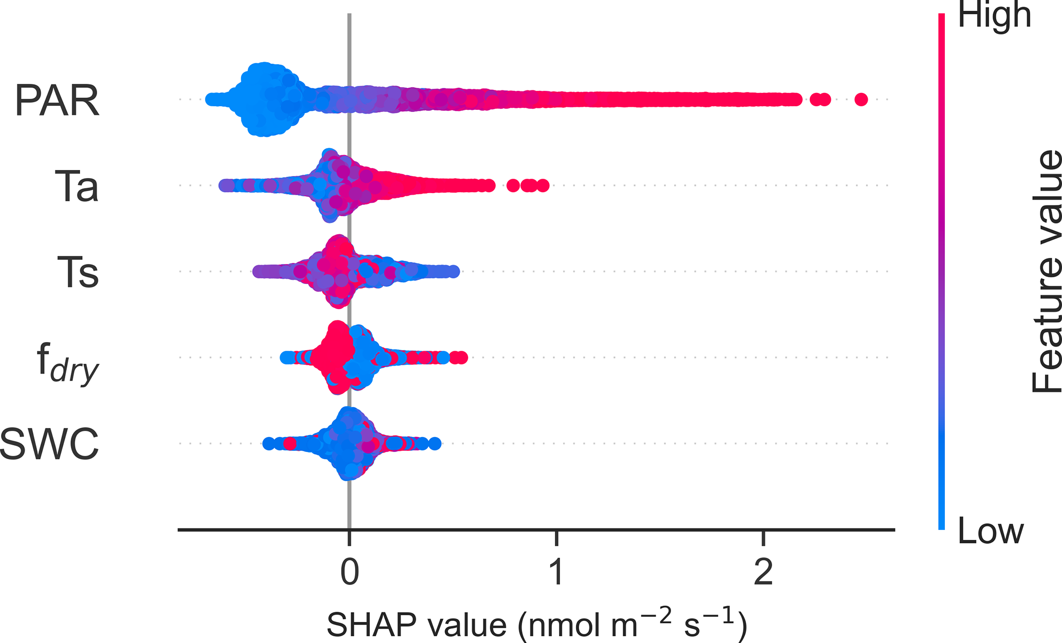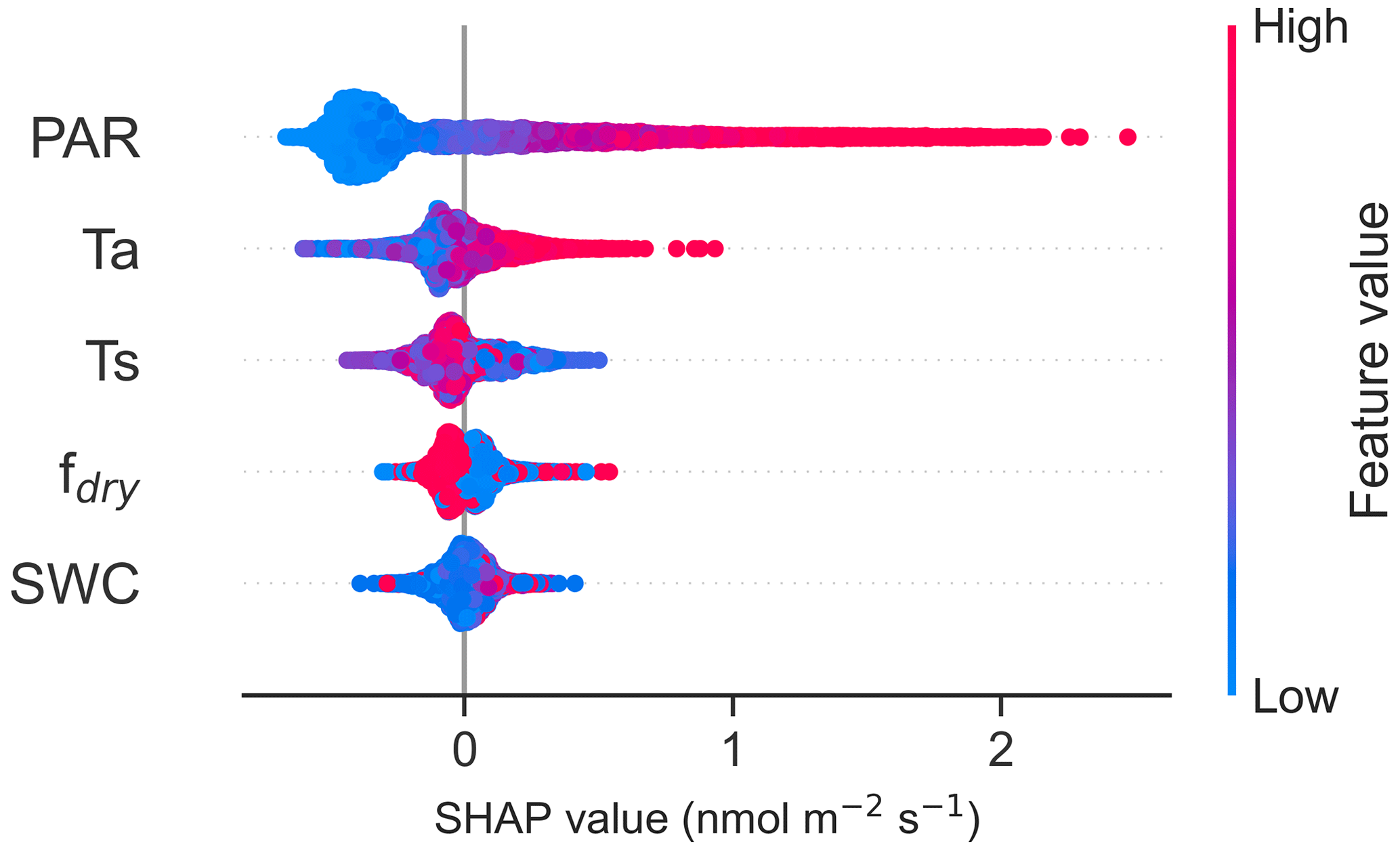 The results from the SHAP values were consistent with the results of the Spearman correlations, with the highest positive fluxes associated with high PAR (Fig. 6). Ts and Ta were found to be the second- and third-most important drivers, with higher positive fluxes (emission) associated with low soil temperature and high air temperature. In the nighttime data, Ts was the most important driver, with the higher negative fluxes (uptake) associated with high soil temperature (Fig. S6), consistent with Fig. 6. Additionally, SHAP values from all data and nighttime data indicated that higher fdry led to decreased fluxes, meaning that higher fluxes were observed in the wetter conditions (Figs. 6, S6). Figure S7 presents partial dependence plots of SHAP values for each feature.