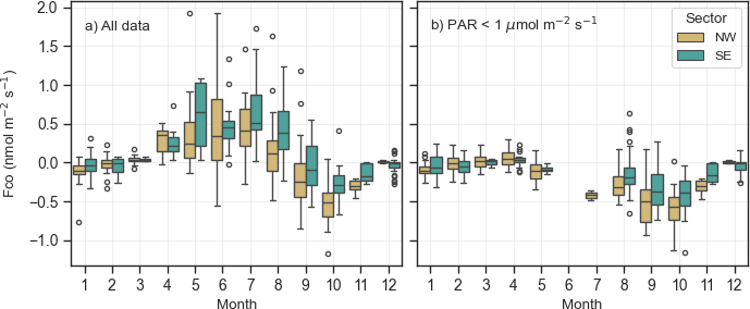 Figure 7The boxplot of NW (yellow) and SE (turquoise) CO fluxes in different months (a) for all PAR levels and (b) in dark conditions for PAR < 1 µmol m−2 s−1. The box represents the interquartile range (IQR), with the lower limit at the 25th percentile and the upper limit at the 75th percentile, while the whiskers indicate the minimum and maximum values. Black dots represent outliers, defined as 1.5 × IQR.