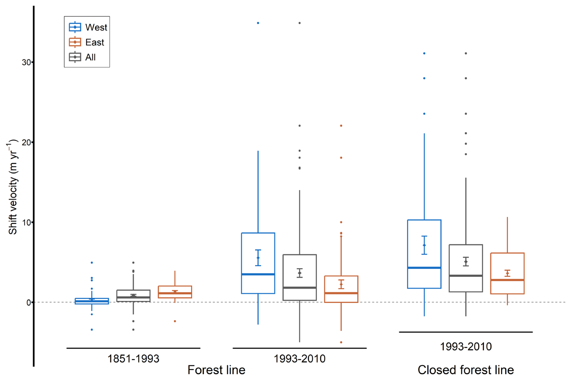 Figure 5Mean, standard error and boxplot for forest-line and closed forest-line shift velocities in the French Pyrenees for the 1851–1993 and 1993–2010 periods, for the entire study area, and for the western and eastern groups (separated at an RGF93 longitude of 520 km).