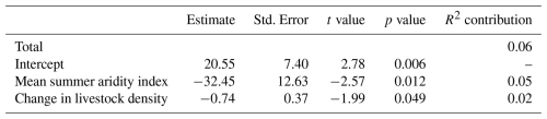 Table 3Estimates with associated standard errors, t-values and p-values for the linear model that predicting forest-line shift velocity between 1993 and 2010 in the French Pyrenees according to the mean summer aridity index in the 300 m above the 1993 forest line, and to change in livestock density between 2000 and 2010. The contribution of each variable to the total adjusted R2 of 0.06 is presented in the last column.