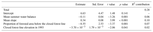 Table 4Estimates with associated standard errors, t-values and p-values for the linear model predicting closed forest-line shift velocity for the 1993–2010 period in the French Pyrenees based on mean summer water balance and mean slope in the 300 m above the 1993 closed forest line, proportion of forested area below the closed forest line, and closed forest-line elevation in 1993. The contribution of each variable to the total adjusted R2 of 0.28 is presented in the last column.