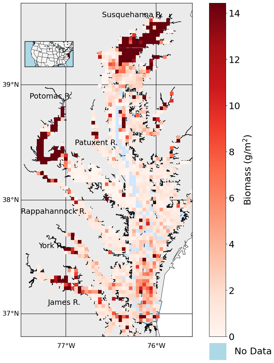 Figure 2Average summer biomass density from 1995 to 2022 from the Chesapeake Bay Benthic Monitoring Program. Biomass values are shown using a red color scale, white represents 0 g m−2, light blue indicates open water grid cells with no data, and gray represents land areas with no data.