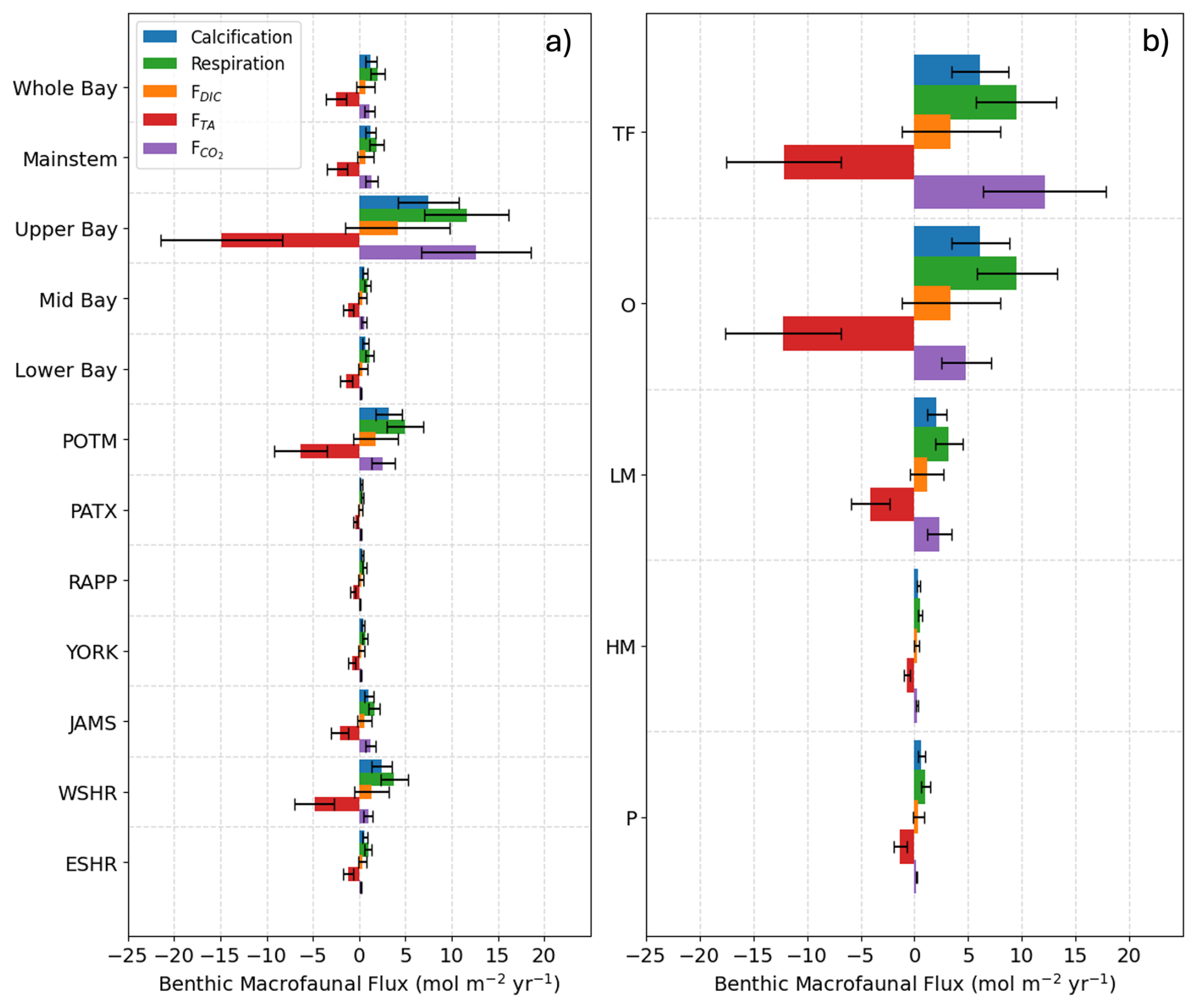 Figure 4Average benthic macrofaunal fluxes by (a) Bay region and (b) salinity zone. Tributary and sub-estuarine acronyms: ESHR – Eastern Shore tributaries; WSHR – Western Shore tributaries; POTM – Potomac River; PATX – Patuxent River; RAPP – Rappahannock River; YORK – York River system (including Mattaponi and Pamunkey Rivers); JAMS – James River. Salinity zone abbreviations: TF – Tidal Freshwater (0–0.5 ppt), O – Oligohaline (0.5–5 ppt), LM – Low Mesohaline (5–12 ppt), HM – High Mesohaline (12–18 ppt), P – Polyhaline (≥18 ppt). Error bars represent uncertainty ranges (Appendix B).