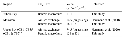 Finally, we compared CO2 generated from respiration and calcification (Eq. 17) to published estimates of air–sea CO2 exchange (Chen et al., 2013; Herrmann et al., 2020).