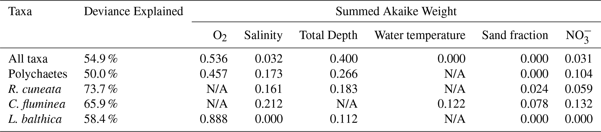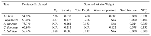 As described earlier, we initially identified eight environmental variables: O2, salinity, total depth, water temperature, sand fraction, NO, Ωarag, and Δ[O2]. To avoid multicollinearity, which can distort GAM results (Grüss et al., 2014; Grüss et al., 2018; Guisan et al., 2002), we used Pearson's correlation coefficients (r) to evaluate the linear correlation between the predictor variables. When two variables were highly correlated (r>0.7) (Dormann et al., 2013), we retained the variable that was more directly measurable and broadly understood across estuarine systems. Based on this assessment, we excluded Ωarag and Δ[O2] due to their strong correlation with other variables and retained the remaining six variables for GAM analysis. While necessary for model stability, this approach may limit the explanatory power of the GAM by excluding ecologically meaningful predictors. The full list of candidate variables and their inclusion status is provided in Table 1.