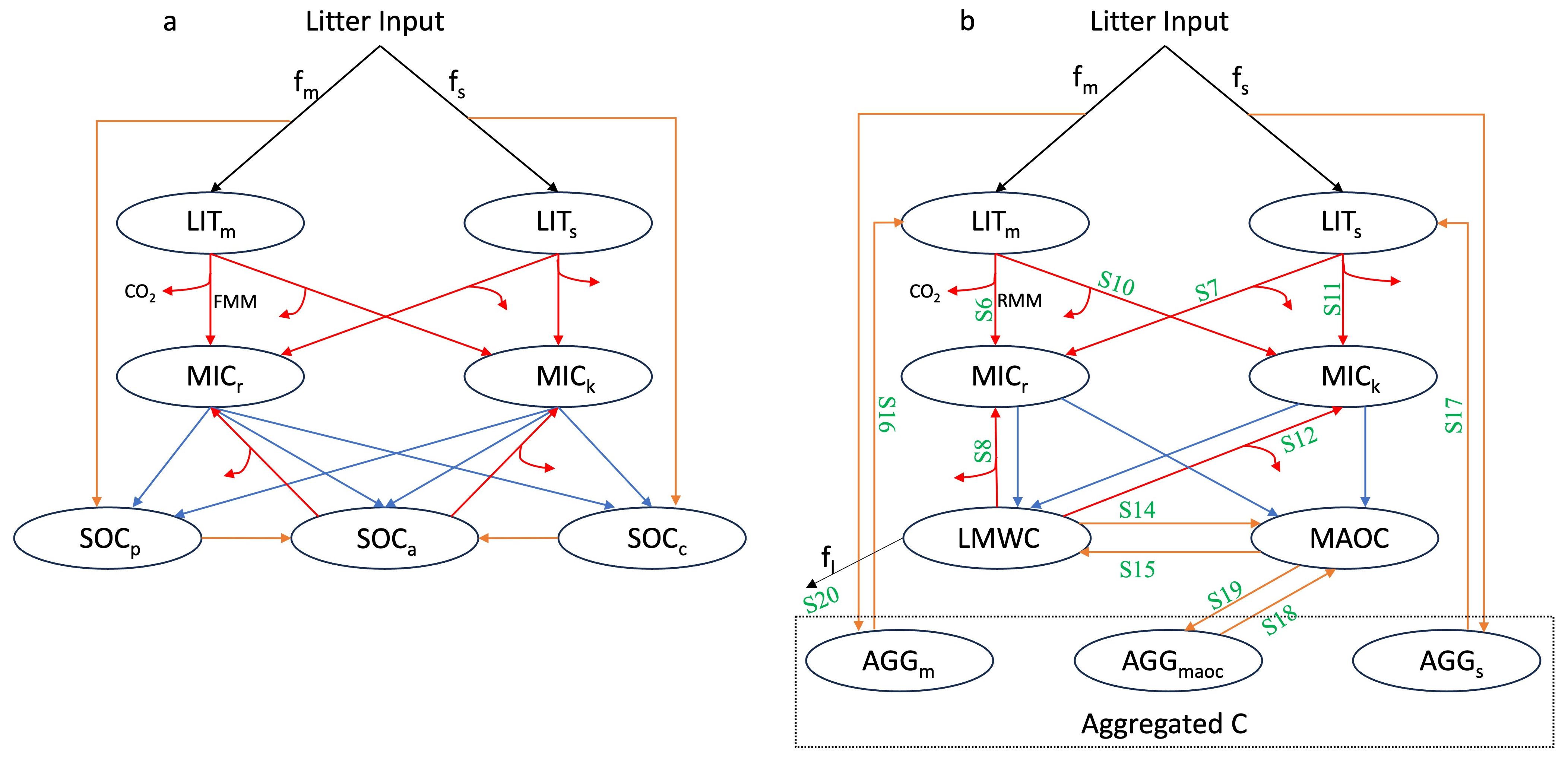 Figure 1SOC pools and fluxes represented in (a) MIMICS and (b) MES-C. Black lines represent carbon getting into and out of the soil system via litter input and leaching (fl) process. Litter inputs are partitioned into metabolic and structural litter pools (LITm and LITs, respectively) based on litter quality (fm and fs). Red lines represent decomposition of litter and SOC via two functional types of microbes (MICr and MICk) governed by forward Michaelis-Menten (FMM) and reversed Michaelis-Menten (RMM) kinetics in MIMICS and MES-C, respectively. Partitioning of C fluxes entering microbial biomass pools and heterotrophic respiration is determined by microbial growth efficiency. Blue lines represent the turnover of microbial biomass, which is partitioned into available, physically protected and chemically recalcitrant SOC pools (SOCa, SOCp and SOCc, respectively) in MIMICS, and into light molecule weight carbon (LMWC) pool and mineral associated carbon (MAOC) pool in MES-C. Orange lines represent the protection/unprotection of SOC. In MES-C, SOC protection is explicitly represented in the form of MAOC, and aggregated C including aggregated metabolic C, aggregated structural C and aggregated mineral associated C (AGGm, AGGs and AGGmaoc, respectively). Green labels in panel (b) correspond to the equations for fluxes described in Supplement.