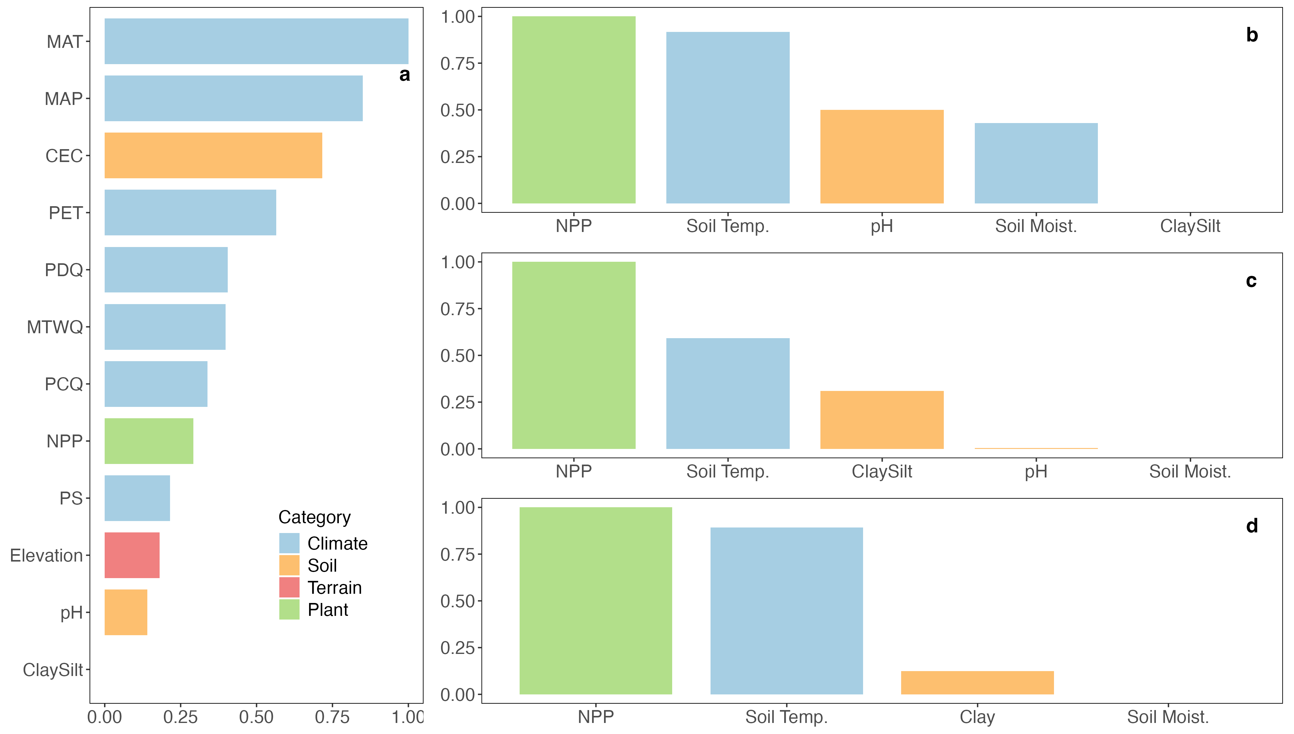 Though SOC variation may be dominated by specific variables under certain environmental conditions, it's generally the result of a combined influence of multiple factors acting together. A good representation of the combined effects is pivotal to improve model accuracy and reduce uncertainties in future carbon-climate change feedback.