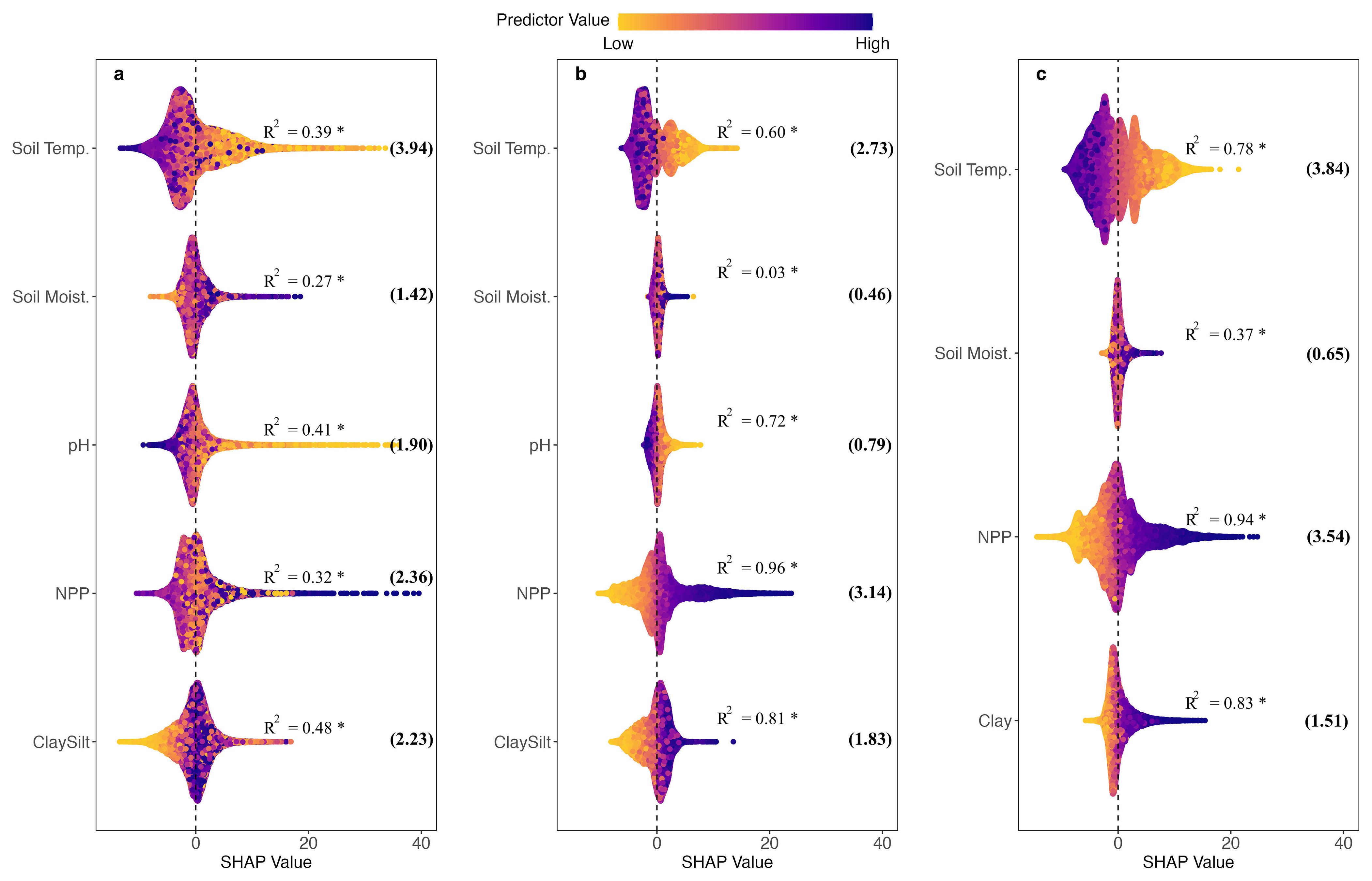 Figure 4SHAP values showing the impacts of predictors on (a) observed SOC; (b) modelled SOC by MES-C; (c) modelled SOC by MIMICS. The jitter along vertical axis is used to reduce point overlap and visualise data density. The vertical dashed line represents SHAP values at 0. Numbers in brackets are mean absolute SHAP values for each predictor. The R2 values from linear regressions between SHAP values and predictor values are also shown with * indicating statistical significance at the 0.05 confidence level. Full names of predictors can be found in Table 1.