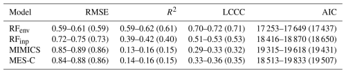 Vertically, there is a dramatic decline in model performance in predicting SOC below 30 cm soil (Table S7), which is consistent across all models in this study and has also been found in many other studies (Kempen et al., 2011; Wadoux et al., 2023). This decline in RFinp and RFenv is partially explained by the fact that climatic covariates such as MAT and MAP represent better the conditions for surface layers but have less correlation with subsurface SOC (Minasny et al., 2013). However, the decline of performance beyond 30 cm soil in MIMICS and MES-C underscores the ongoing challenge of unravelling SOC turnover processes in subsurface soils.