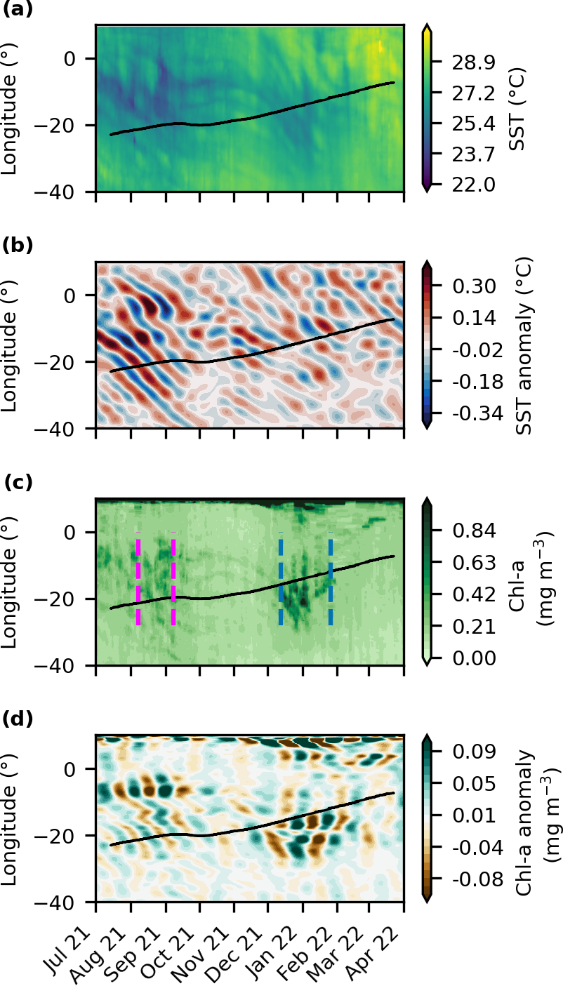 Figure 1Satellite-derived properties as a function of time (x-axis) and longitude (y-axis): (a) sea surface temperature (,°C), (b) bandpass-filtered sea surface temperature anomaly, (c) surface chl a concentration (mg m−3), and (d) bandpass-filtered chl a anomaly along the equator from July 2021 to March 2022. The black line represents the float trajectory from west to east. The blue and magenta lines determine the beginning and the end of the first and the second export event, respectively.