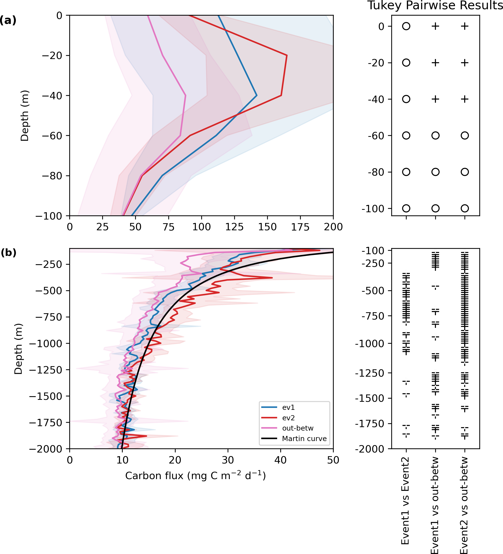 Figure 4Averaged carbon flux profiles () along the plumes during event 1 (blue), event 2 (red), and the outside-between mask (purple) (a) from 0–100 m, (b) from 200–2000 m. The shading represents the standard deviation. The Tukey pairwise results were conducted for each depth. Plus signs indicate a significant difference, and blank space or empty circles indicate a non-significant difference. The black line represents the Martin curve of event 2 calculated using Eq. (4) with b = −0.6 and FZ0 = 100 m.