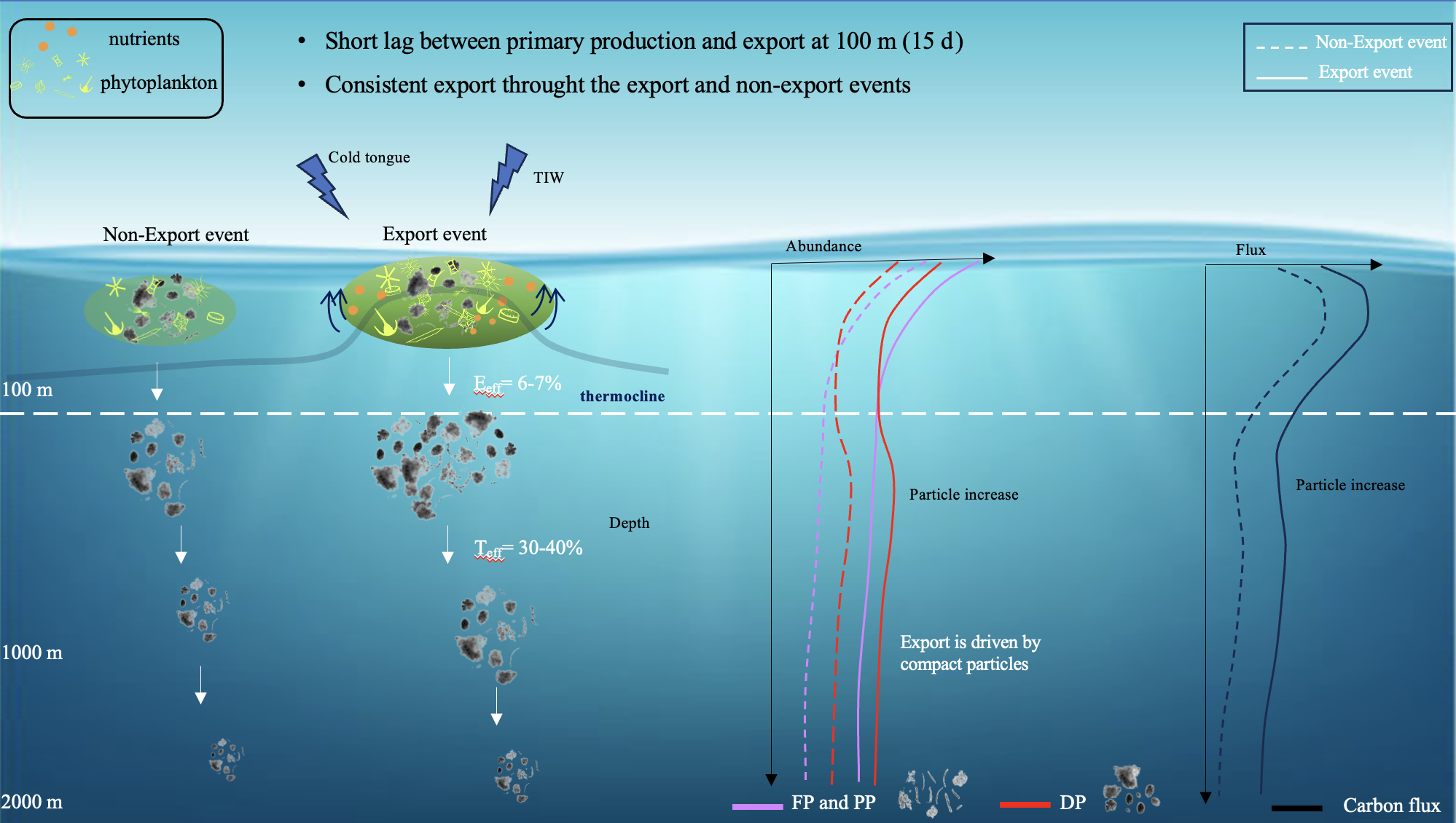 Figure 6Illustrative example of the particle export system in the Atlantic equatorial region during export and non-export events. FP: fiber particles, PP: porous particles, DP: dense particles. Teff: Transfer efficiency, Eeff: Export efficiency, TIW: Tropical instability Wave. We do not distinguish between small and large particles, as the particle composition remains consistent across both export and non-export events and only the concentration changes.