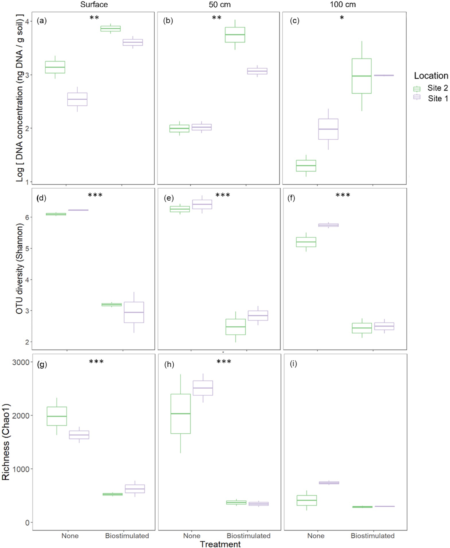 Figure 3Effects of ureolytic biostimulation on edaphic microbial communities. Microbial DNA concentrations (a–c) extracted from the studied soils were higher in biostimulated compared to non-treated soils. However, microbial diversity (d–f) decreased following the treatment across depths (2-way ANOVA: F1,18=404.94, P=8.66×10-14), as well as OTU richness (F1,18=84.74, P=3.14×10-8, g–i). Asterisks denote the significance level of the differences in the treatment's effect within a specific depth according to pairwise tests.