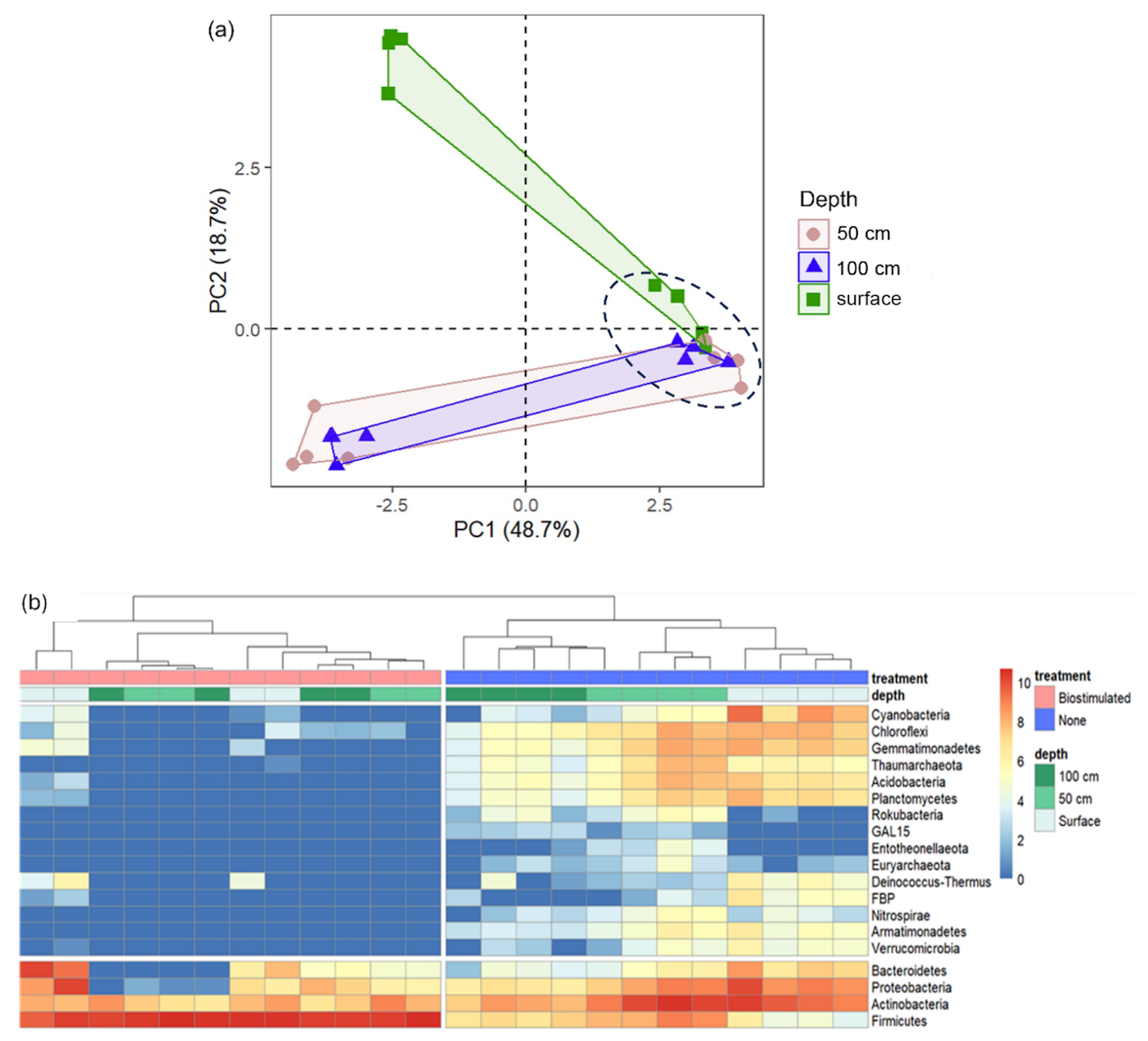 Figure 4Microbial diversity patterns in communities from different soil depths, before and after ureolytic biostimulation. (a) PCA based on OTU relative abundances at the different soil samples. The biostimulated soils are circled by a dashed black line. (b) A heatmap of the changes in the OTU counts (log transformed) of the main prokaryotic phyla between the studied soil samples (columns). The phylogenetic tree represents the similarity between the composition of sample communities based on Euclidean distances.