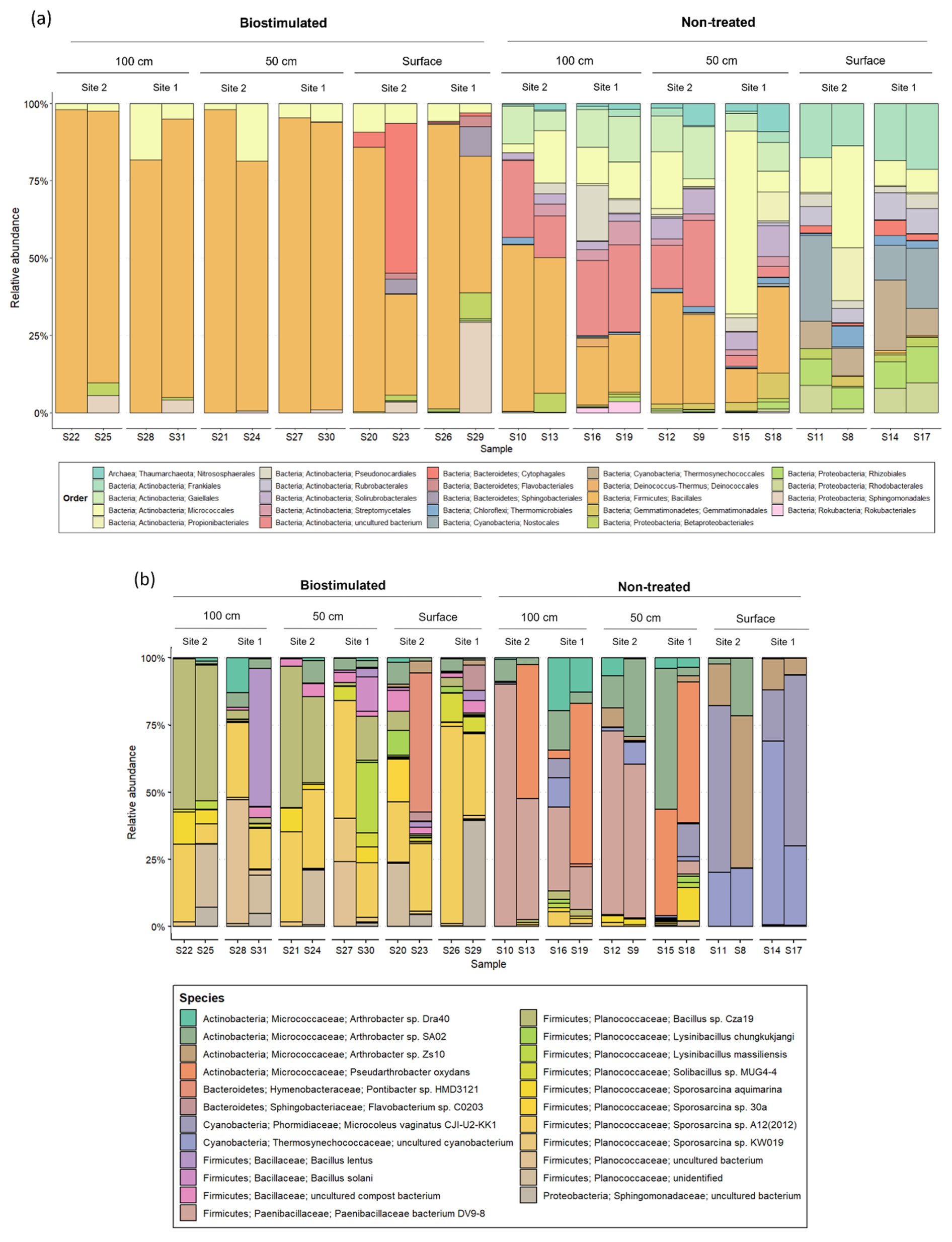 Figure 5The composition of the most prevalent microbial (a) orders (above 1 % of total reads) and (b) specific OTUs (above 5 % of total reads) in studied soil depths, before and after ureolytic biostimulation.