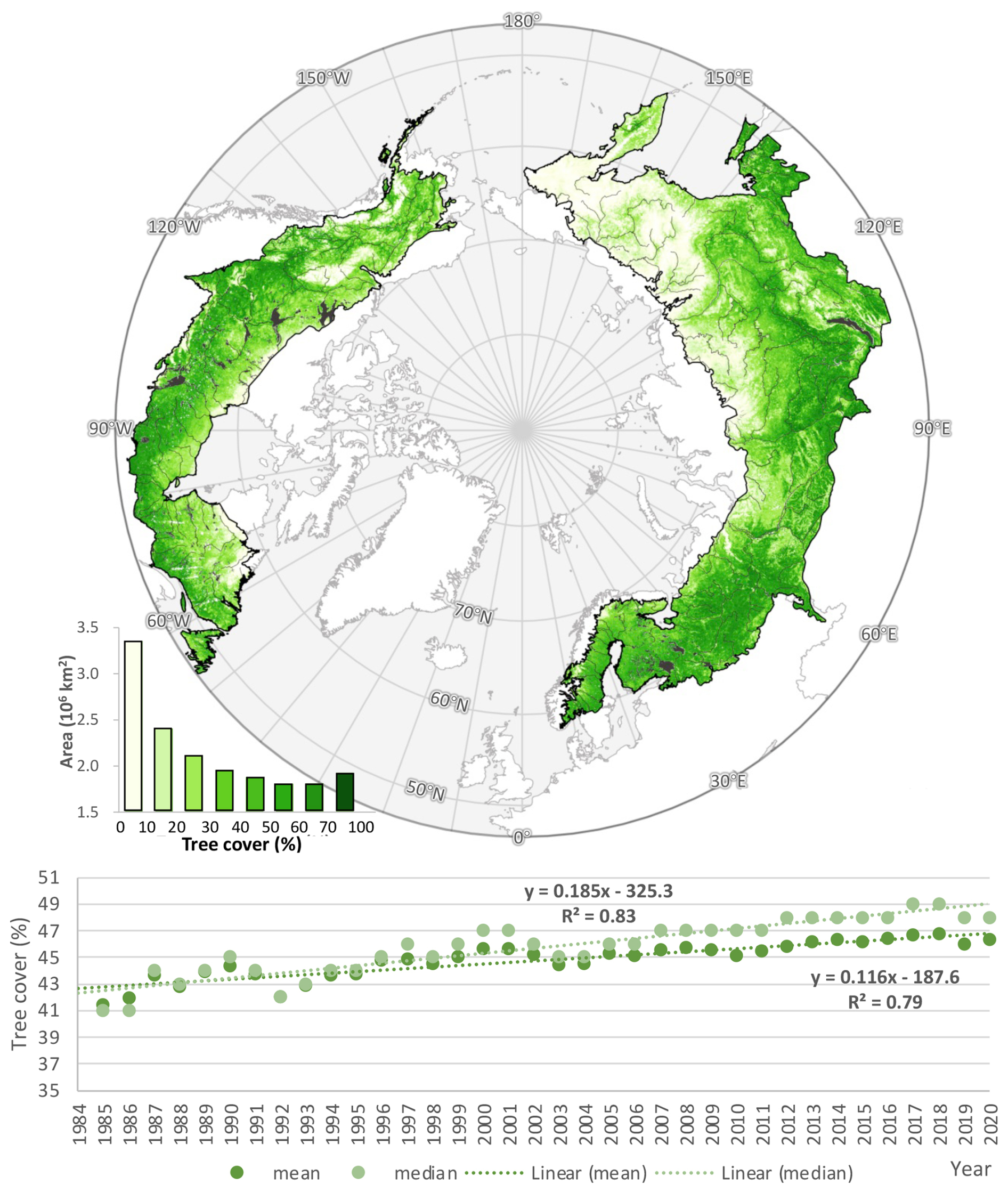 Figure 1Distribution of boreal across boreal ecoregions in 2020. Estimates from 2020 are shown. Data gaps due to clouds were filled with estimates from earlier years. Ecoregions were defined by Dinerstein et al. (2017). The bottom panel shows the increasing density in the overall, pan-boreal density of tree cover from 1985 to 2020.