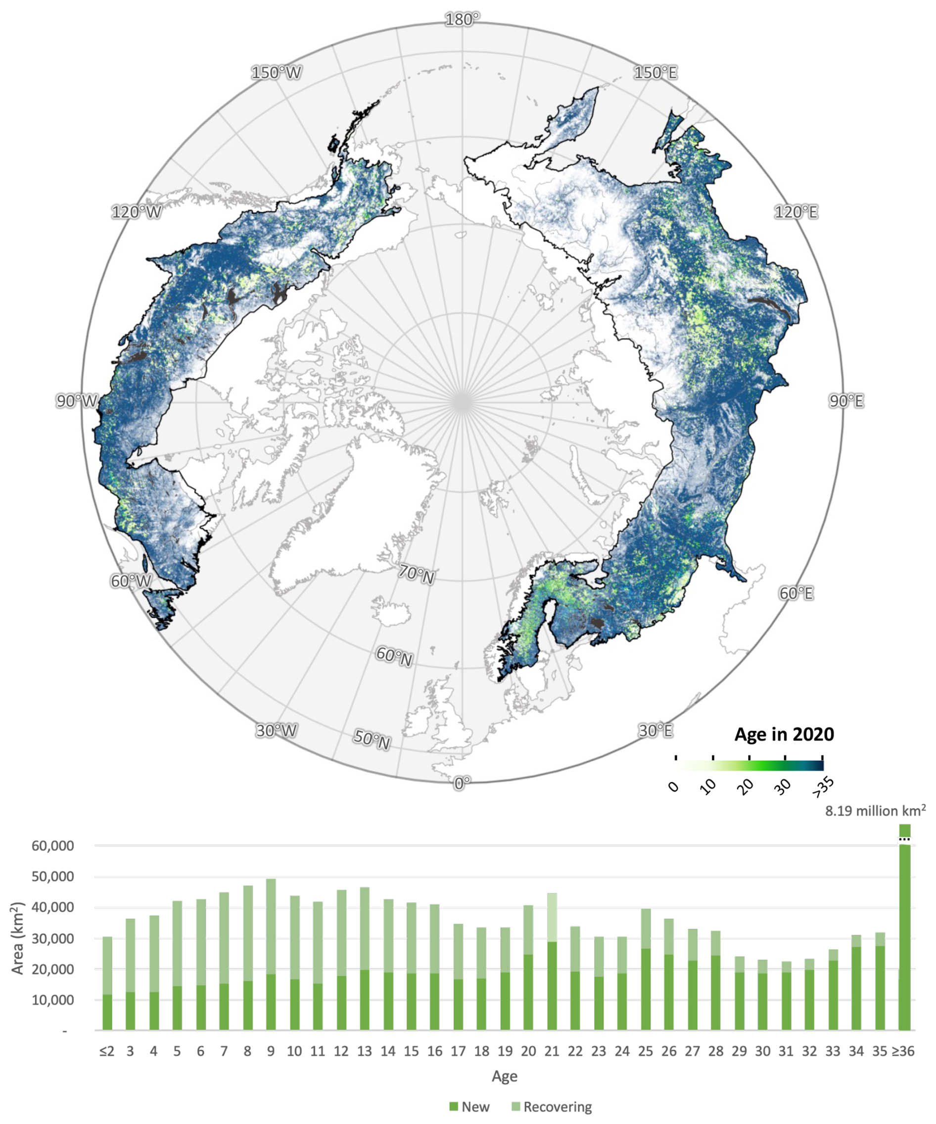Figure 4Spatial distribution of stand age (top) across the boreal ecoregion and frequency distribution of boreal stand age in 2020 (bottom). Forest age-class distribution is defined as years since establishment of pixels identified as forest in 2020. “New” forests were identified as pixels with forest cover following a gain but no prior forest cover or loss earlier in the time series within a 150 m radius (5 pixels) over the observable period (1984–2020); “recovering” forests were identified as pixels with forest cover following a gain where a forest loss had been observed previously in the series (Sect. S9).