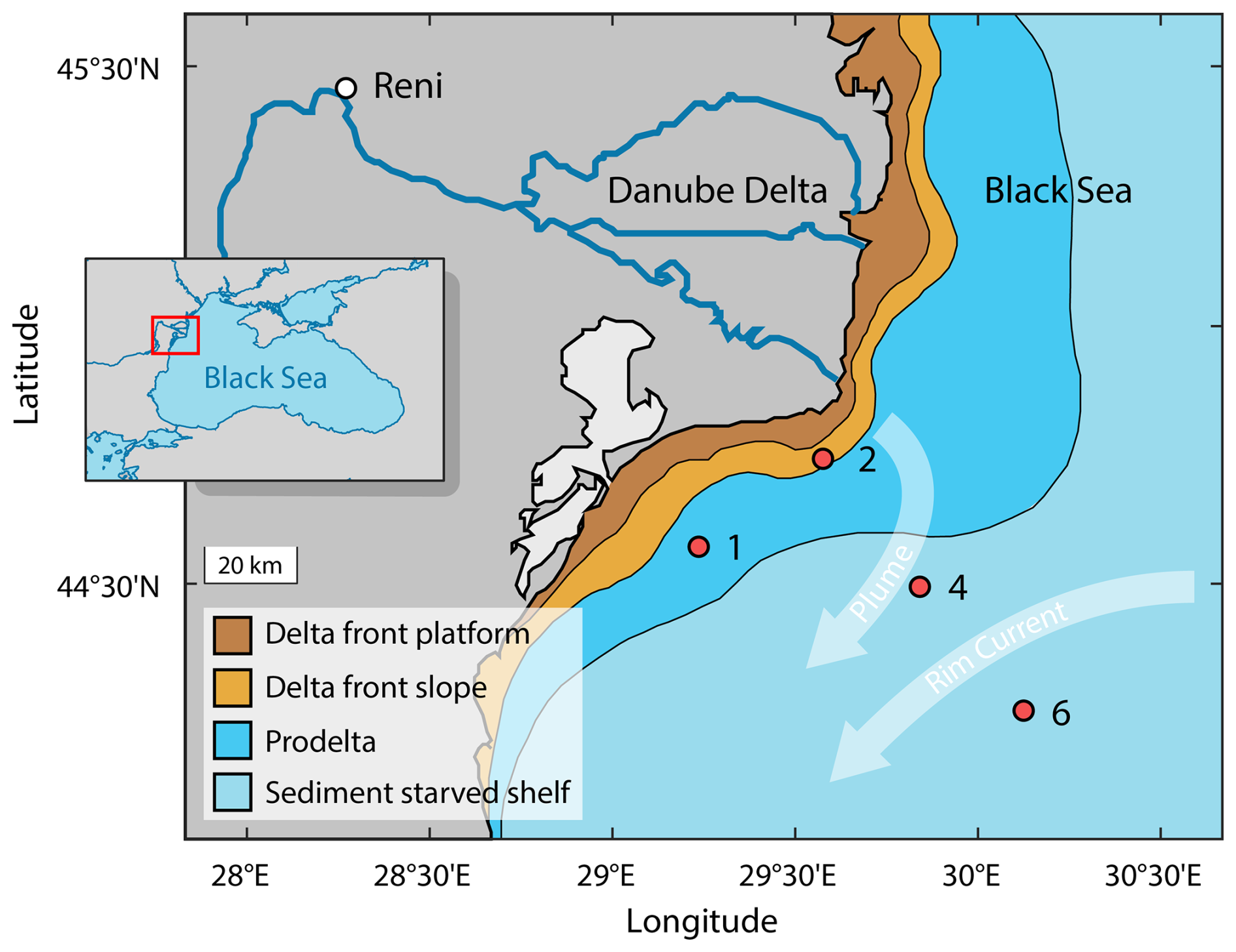 Figure 1Sampling stations of the sediment cores 1, 2, 4 and 6 in the northwestern Black Sea during R/V Mare Nigrum cruise 148 and major depositional units of the Danube Delta (after Panin et al., 2016). Light arrows indicate the general surface water currents of Danube River Plume and Rim Current. Insert: Study area (red rectangle) within the Black Sea region.