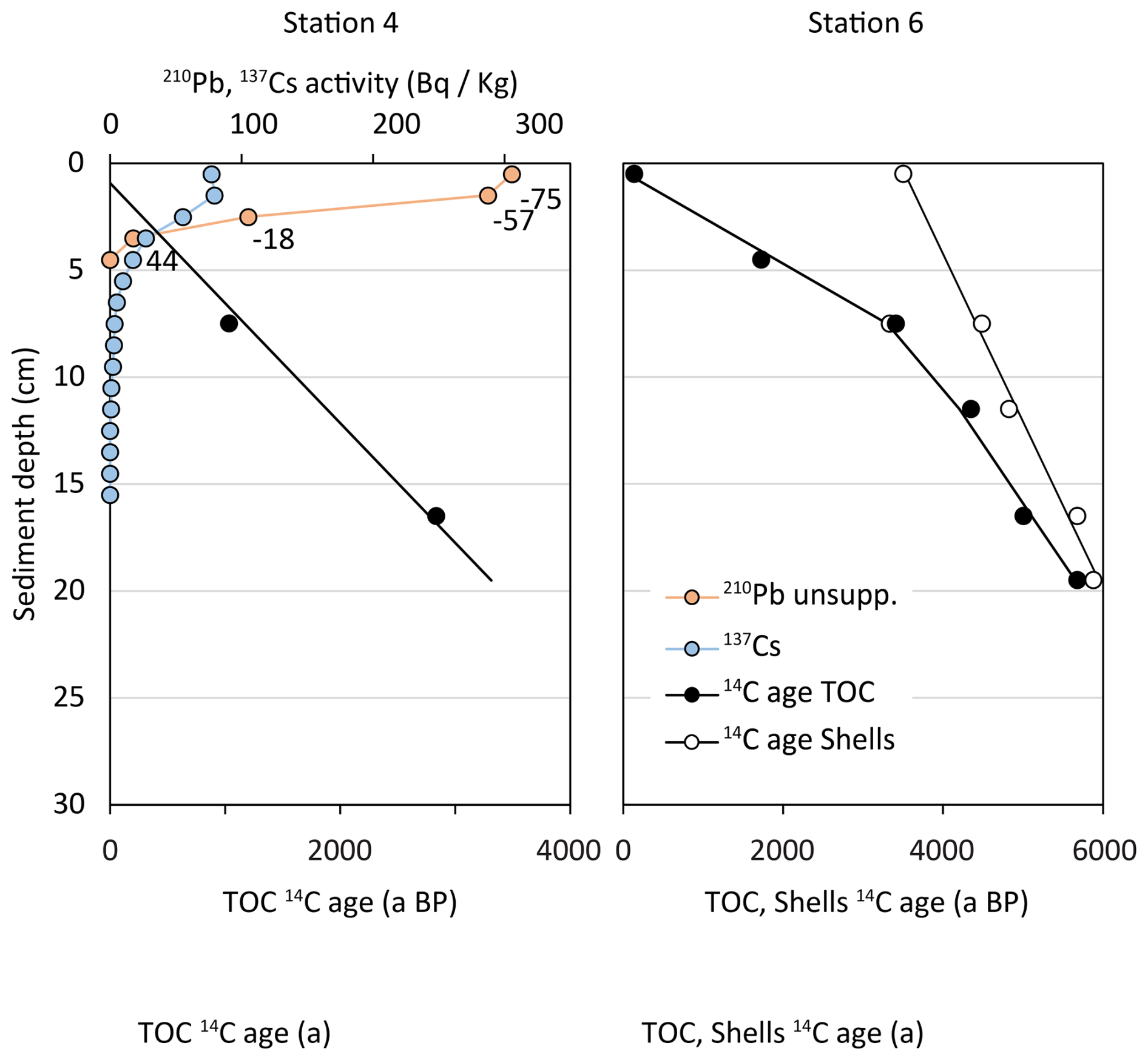 Additional to 14C, we measured 137Cs and unsupported 210Pb in Station 4 sediment, where unsupported 210Pb was highest at the sediment surface (306 Bq kg−1 dry sed.) and decreased exponentially with depth. 210Pb was below detection limit below 4 cm sediment depth (Fig. 2). The estimated sediment ages ranged from −75 a BP at 0.5 cm sediment depth to 44 a BP at 3.5 cm sediment depth. Similarly, 137Cs activity was highest at the sediment subsurface (79 Bq kg−1 dry sed.), but was detectable to deeper sediment layers than unsupported 210Pb (Fig. 2). No 210Pb and 137Cs measurements of sediment from Station 6 are available.