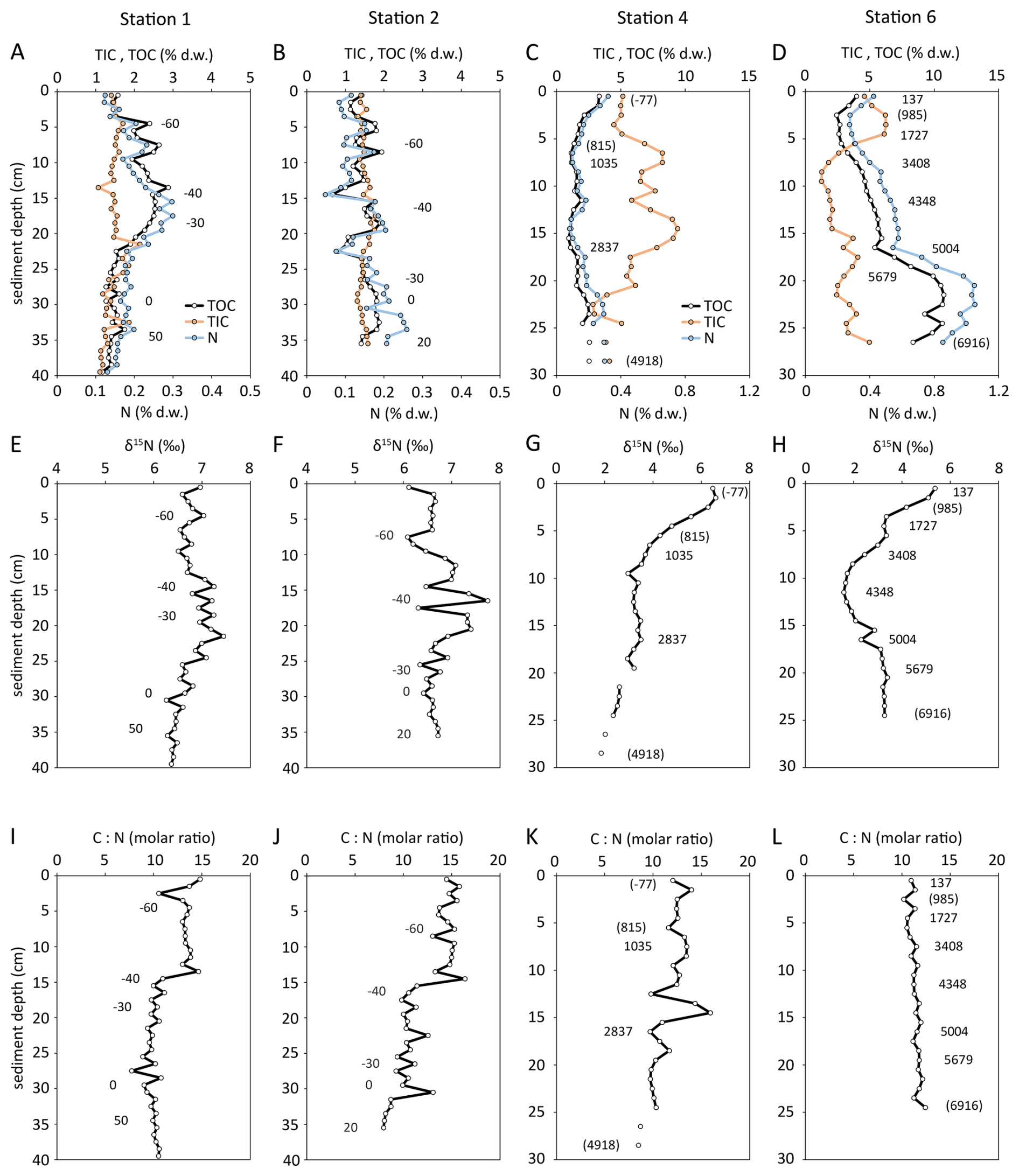 Figure 3From Stations 1–6, depth profiles of TIC (carbonate), TOC (organic sediment), total nitrogen (A–D), measured δ15N values of bulk sediment (E–H), and molar ratio of organic sediment (I–L). Numbers refer to the sediment age BP (0 a BP = 1950 CE, negative age values are after 1950 CE, positive age values are before 1950 CE), based on 210Pb (Stations 1, 2) and 14C (Stations 4, 6). Numbers in parentheses were estimated by linear interpolation. 210Pb data from Constantinescu et al. (2023).