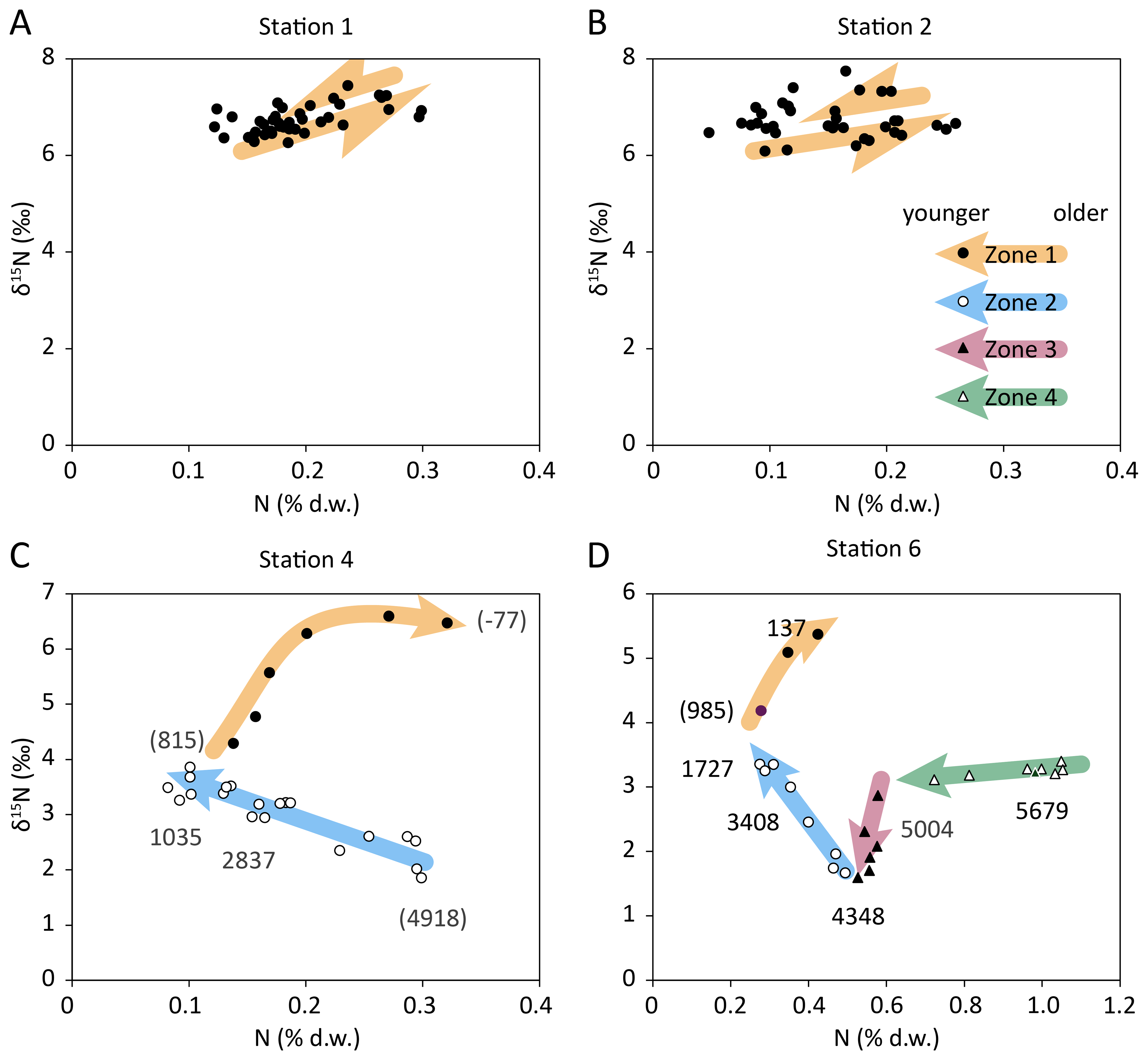 Figure 4Sedimentary δ15N vs. sedimentary nitrogen content at Station 1 (A), Station 2 (B), Station 4 (C), and Station 6 (D). The different symbols indicate different process zones within the sediment column: (Zone 1) filled circles indicate modern eutrophication, (Zone 2) open circles indicate diagenetic enrichment, (Zone 3) filled triangles indicate the gradual transition between two isotopically distinct nitrogen sources, and (Zone 4) open triangles indicate Unit II sapropel. Numbers refer to the 14C-based sediment age, numbers in parentheses were estimated by linear interpolation. Coloured arrows represent the arrow of time for distinct trends of δ15N vs. N content.