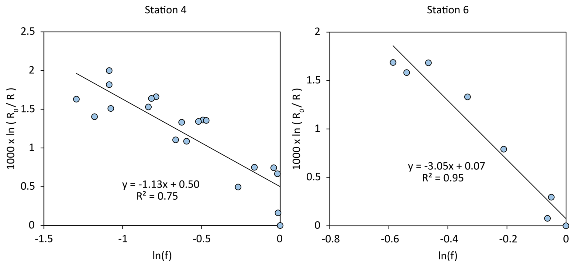 The apparent isotopic fractionation factor (ε) was calculated by means of Rayleigh plots (Möbius, 2013). From the analysed subset of sediment samples, we used the largest measured total N content as reference for calculation of the remaining N fraction (f), which consequently plots at the coordinate origin.