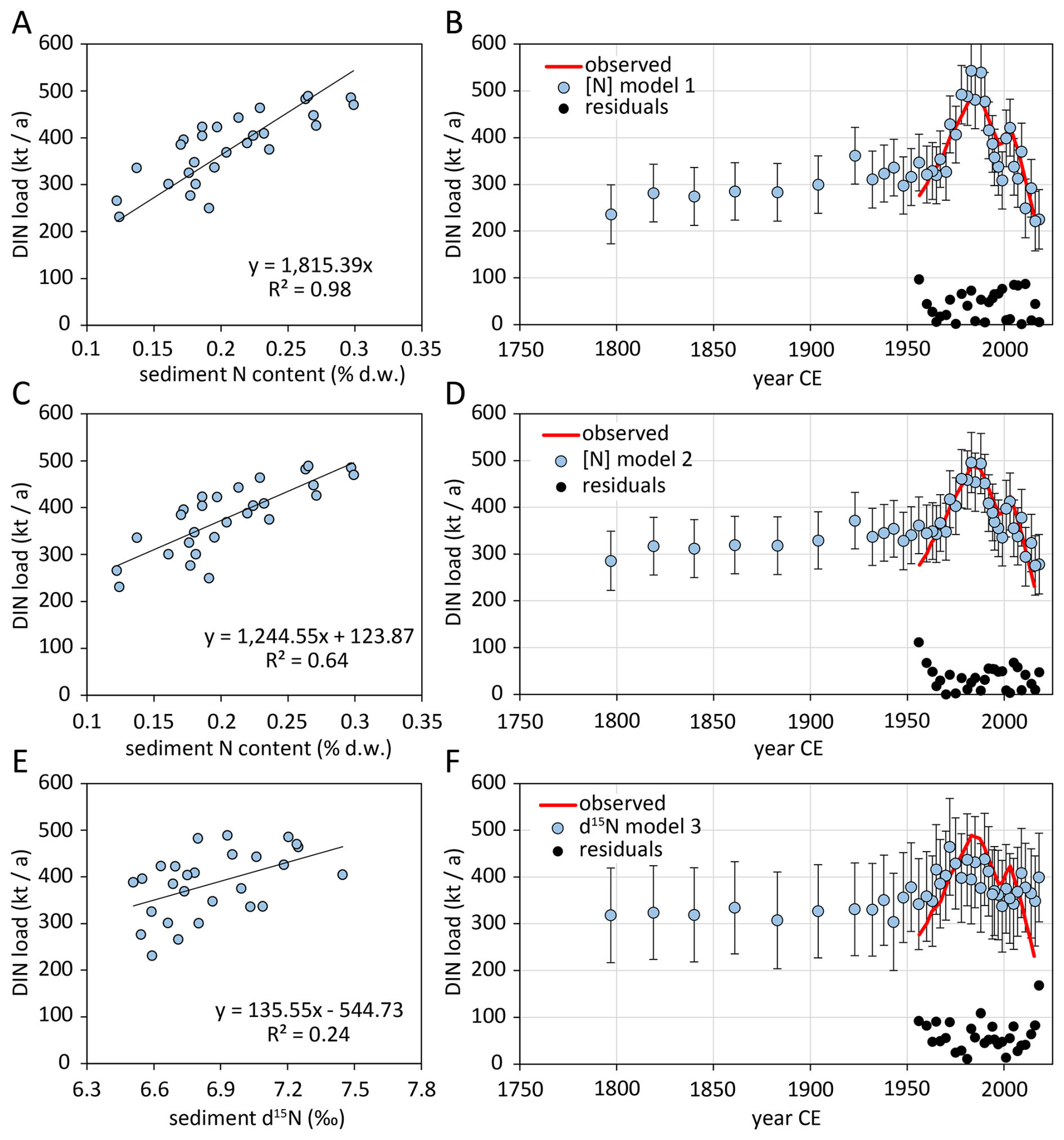 The correlation of Danube DIN loads with sediment N content and δ15N in the nearshore cores 1 and 2 at a given time was examined to develop a simple empirical model to reconstruct historical DIN loads for the period before measurements were available. Using core 2, no meaningful correlation was found (not shown). Using core 1, the DIN load of Danube at Reni station (Kovacs and Zavadsky, 2021) correlated significantly with the bulk N content (Model 1: R2=0.98, Model 2: R2=0.64) and less significant with δ15N (R2=0.24, Model 3). The N content-based Models 1 and 2 had average residuals with respect to observed DIN loads of 36 ± 26 and 42 ± 31 kt yr−1, respectively (Fig. 6B, D). The average residuals of the δ15N-based Model 3 were 61 ± 33 kt yr−1 (Fig. 6F). For the period 1800–1950, all three models estimated that the Danube DIN load was 236 to 318 kt yr−1 in 1800 CE and increased gradually with 0.2 to 0.5 kt yr−1.