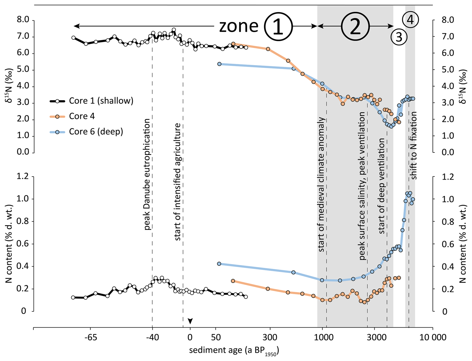 The youngest major event reflected in the sediment record is the massive eutrophication during the “Green Revolution” since the 1960s, with intensified discharge of nutrients, enhanced primary production and oxygen consumption due to enhanced organic matter decomposition in deeper water layers, and thus a shallower oxycline. The increased deposition of organic matter with isotopically enriched nitrogen is evident in all cores and is especially obvious in core 1. There, the highest N content and highest δ15N values coincide with the peak of eutrophication during the 1980–1990 period (−30 to −40 a BP1950, see Figs. 3, 7) and decrease simultaneously, in parallel to the dropping nitrogen load of Danube after the 1990s (Kovacs and Zavadsky 2021).