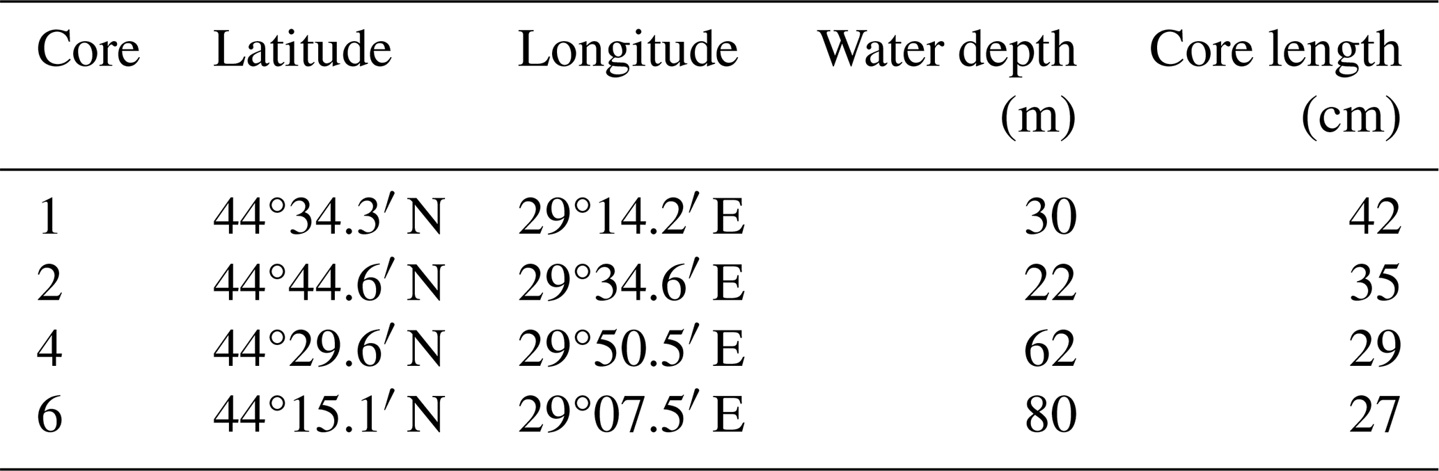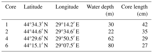 Sampling was performed in early May 2016 during R/V Mare Nigrum cruise MN 148 in the Romanian Shelf area at four stations that span a transect from nearshore to offshore (Table 1, Fig. 1). Water depth at the sampling stations ranged from 22 m (Station 2) to 80 m (Station 6). From each station, sediment cores (20–40 cm length, 6 cm in diameter) were taken with a Multicorer. The sediment cores were immediately sliced in 1 cm intervals and frozen for further analysis. The sediment from stations 4 and 6 was wet sieved through a 400 µm sieve after slicing to collect mussel shells for radiocarbon dating. The <400 µm fraction was freeze-dried and homogenized for analysis of δ15N, organic carbon and nitrogen content.