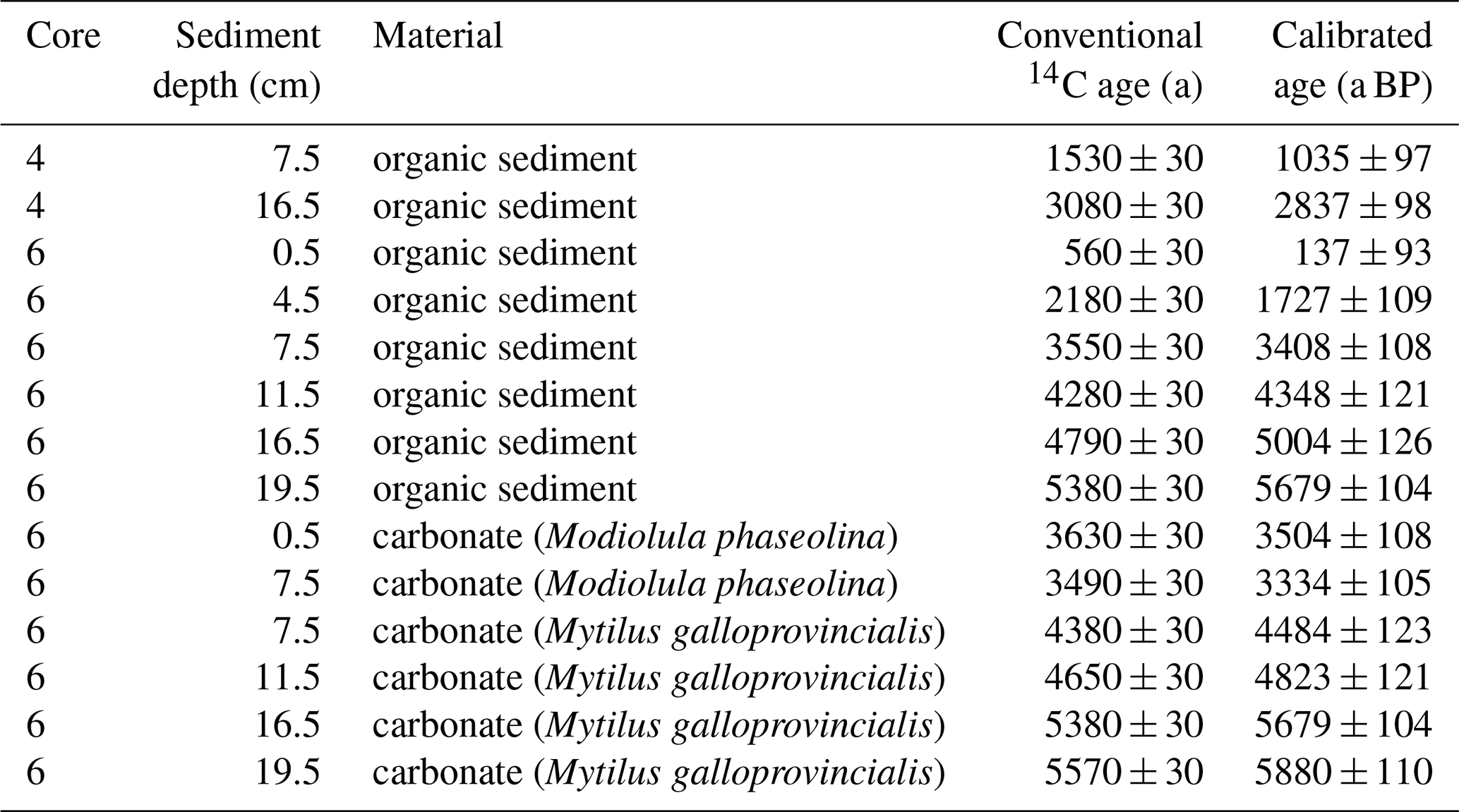 Table 2Results of radiocarbon dating of organic sediment and carbonate shells from Cores 4 and 6, and calibrated age ± 1 SD, using Marine20 and ΔR = a. 0 a BP equals 1950 CE.