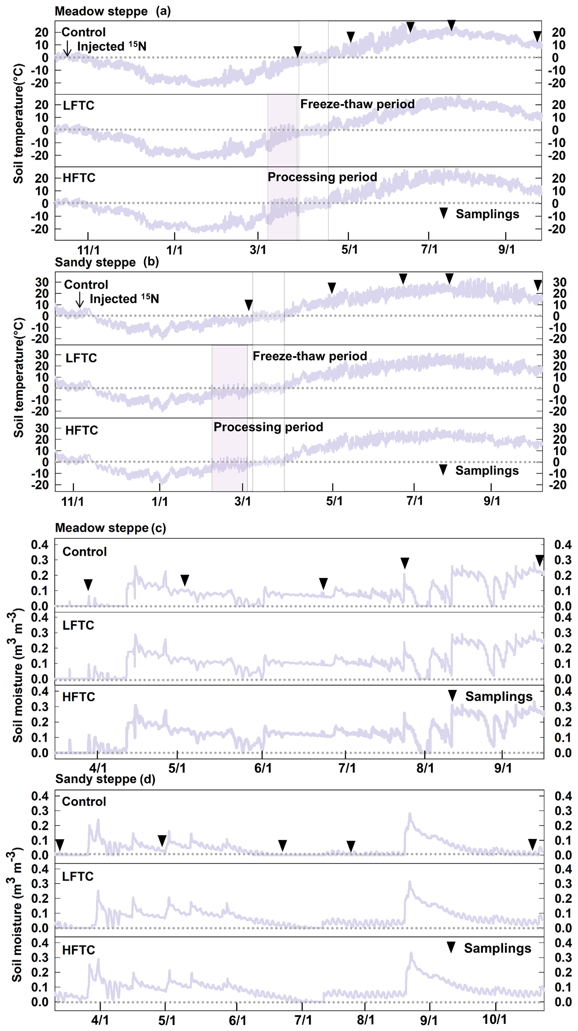 Figure 2Soil temperature (a, b) and moisture (c, d) during the study period under intensified low-frequency freeze-thaw cycles (LFTC; +6 times; conduct 6 additional freeze-thaw cycles) and high-frequency freeze-thaw cycles (HFTC; +12 times; conduct 12 additional freeze-thaw cycles) treatments in a meadow steppe and a sandy steppe. Shaded vertical bars indicate processing (treatment) period. Vertical lines indicate natural freeze-thaw periods. Nablas indicate sampling times, dates for 15N tracer injection and sampling dates are also shown.