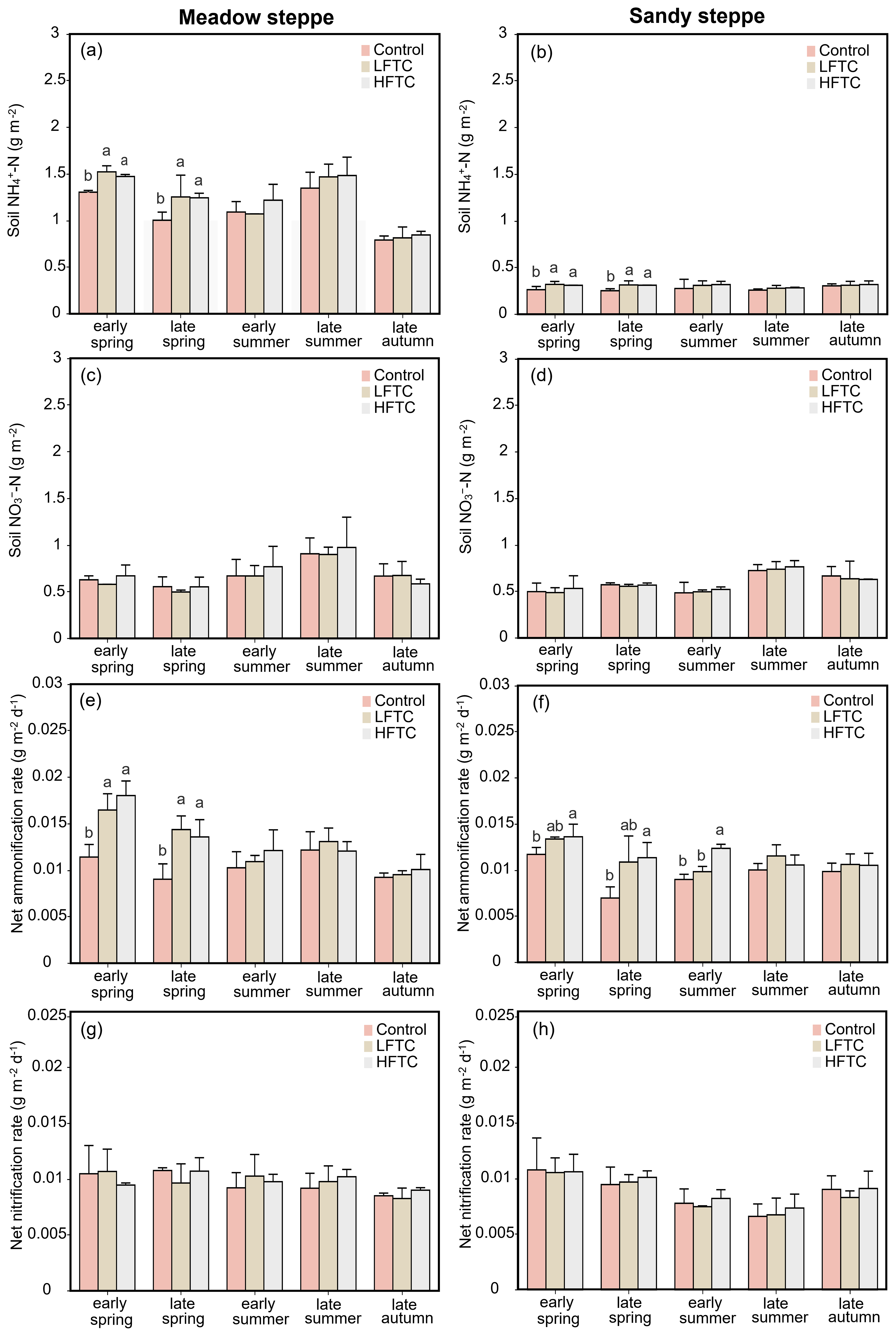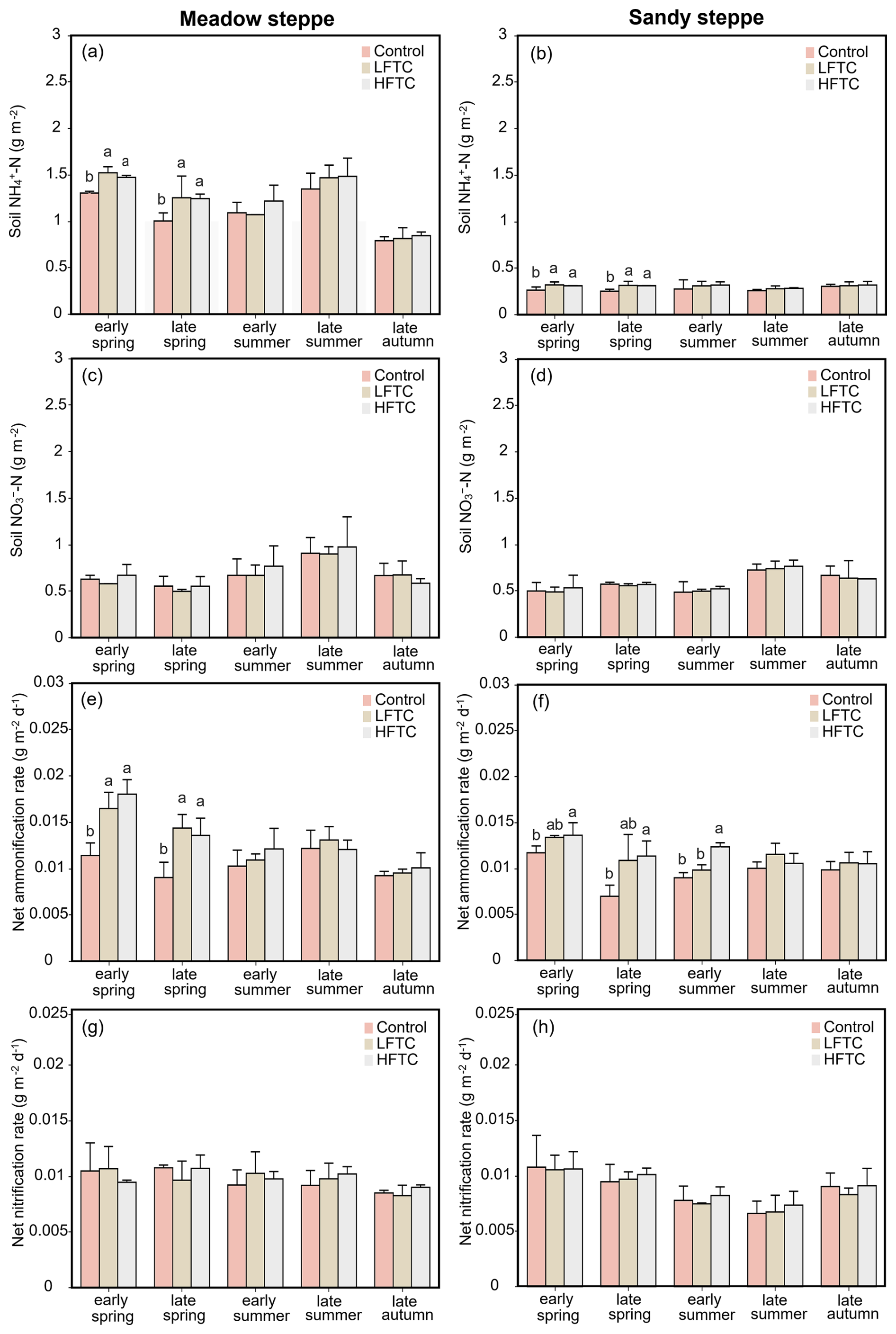 Figure 3Soil NH-N and NO-N concentrations, net ammonification rate and net nitrification rate under intensified low-frequency freeze-thaw cycles (LFTC; 6 times) and high-frequency freeze-thaw cycles (HFTC; 12 times) treatments in the meadow steppe and the sandy steppe. In the meadow steppe, samplings were collected on 26 March (early spring), 4 May (late spring), 23 June (early summer), 22 July (late summer), and 26 September (late autumn) in 2021. In the sandy steppe, samplings were collected on 5 March (early spring), 29 April (late spring), 21 June (early summer), 26 July (late summer), and 15 October (late autumn) in 2021. Vertical bars indicate the standard error (SE) of the means (n=6). Different lowercase letters indicate statistically significant differences among treatment groups within sampling periods (p<0.05).