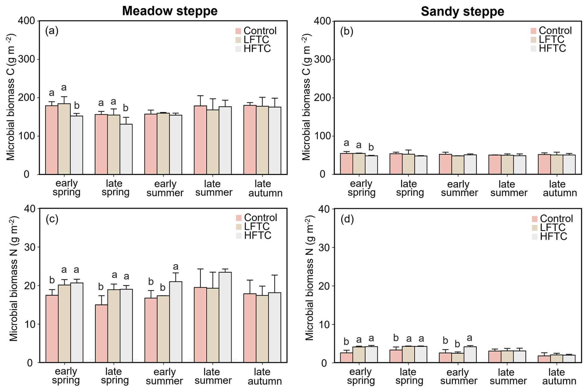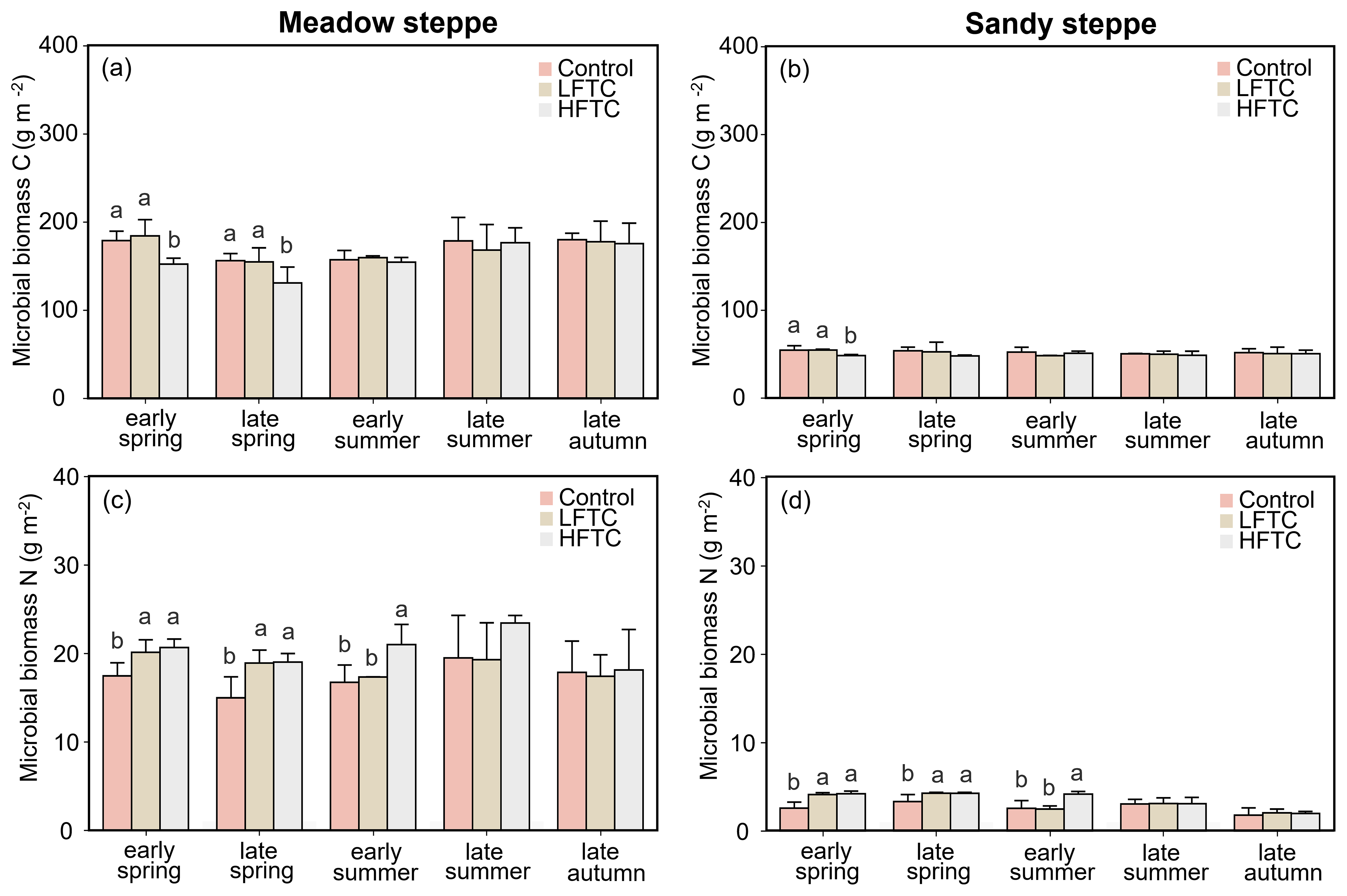 Figure 4Soil microbial biomass C and N under intensified low-frequency freeze-thaw cycles (LFTC; 6 times) and high-frequency freeze-thaw cycles (HFTC; 12 times) treatments in the meadow steppe and the sandy steppe. In the meadow steppe, samplings were collected on 26 March (early spring), 4 May (late spring), 23 June (early summer), 22 July (late summer), and 26 September (late autumn) in 2021. In the sandy steppe, samplings were collected on 5 March (early spring), 29 April (late spring), 21 June (early summer), 26 July (late summer), and 15 October (late autumn) in 2021. Vertical bars indicate the standard error (SE) of the means (n=6). Different lowercase letters indicate statistically significant differences among sampling periods (p<0.05).