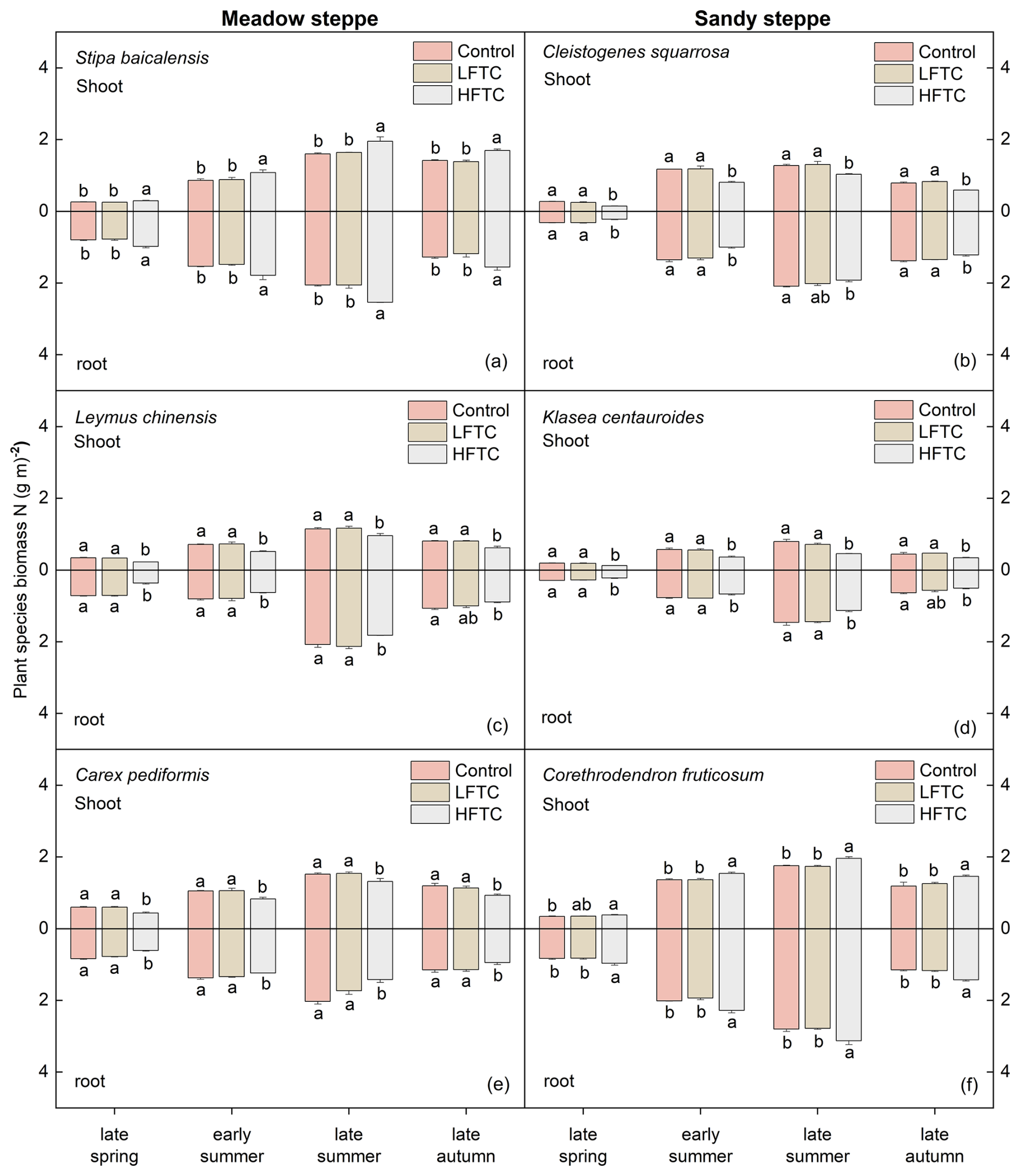 Figure 5Plant biomass N (shoot and root) under intensified low-frequency freeze-thaw cycles (LFTC; 6 times) and high-frequency freeze-thaw cycles (HFTC; 12 times) treatments in the meadow steppe and the sandy steppe. In the meadow steppe, samplings were collected on 26 March (early spring), 4 May (late spring), 23 June (early summer), 22 July (late summer), and 26 September (late autumn) in 2021. In the sandy steppe, samplings were collected on 5 March (early spring), 29 April (late spring), 21 June (early summer), 26 July (late summer), and 15 October (late autumn) in 2021. Vertical bars indicate the SE of the means (n=6). Different lowercase letters indicate statistically significant differences among sampling periods (p<0.05).