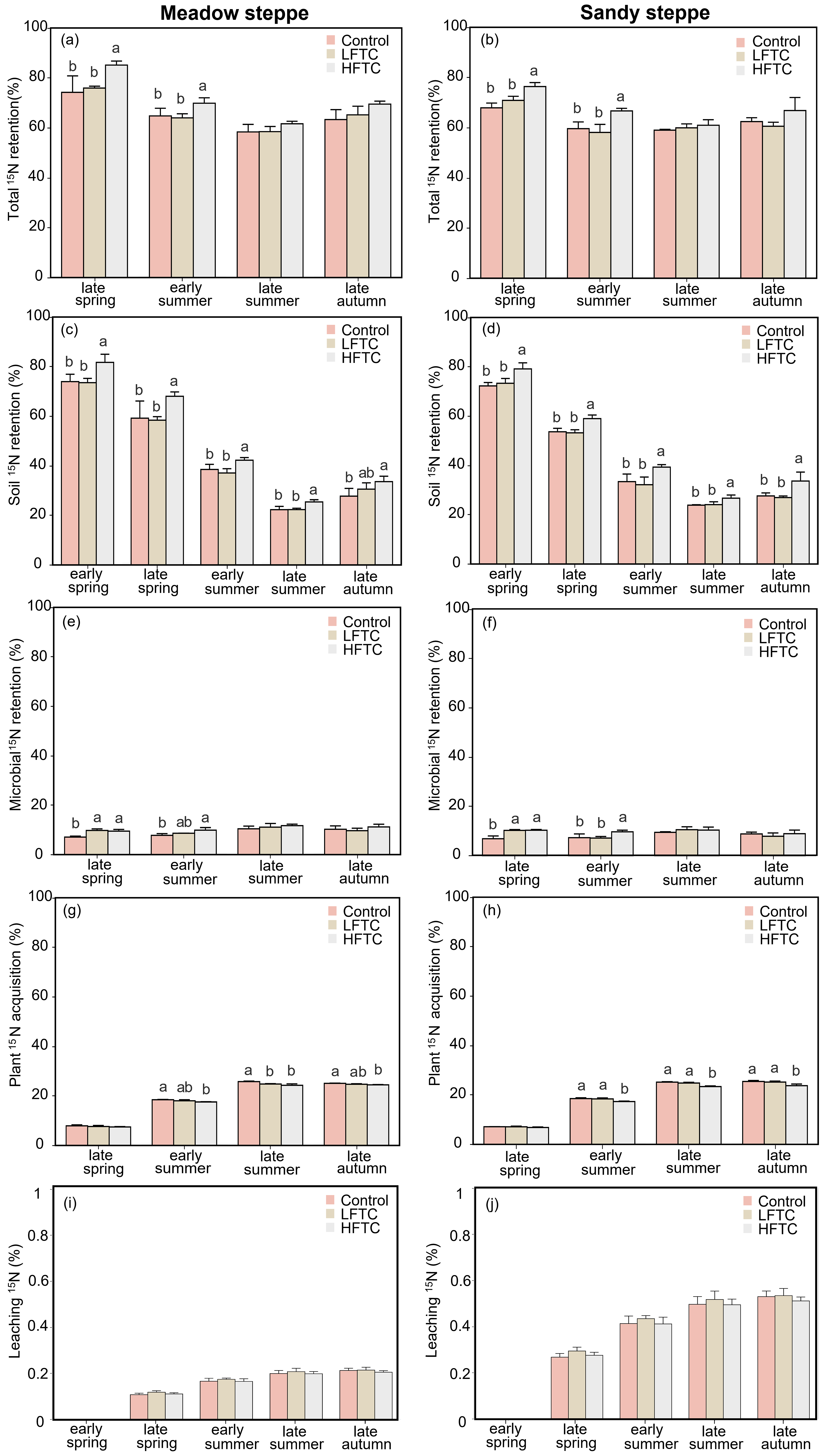 Figure 6Dynamics of 15N retention in soil-microbe-plant system, and leaching 15N (deepsoil, 30–50 cm) under intensified low-frequency freeze-thaw cycles (LFTC; 6 times) and high-frequency freeze-thaw cycles (HFTC; 12 times) treatments in the meadow steppe and the sandy steppe. In the meadow steppe, samplings were collected on 26 March (early spring), 4 May (late spring), 23 June (early summer), 22 July (late summer), and 26 September (late autumn) in 2021. In the sandy steppe, samplings were collected on 5 March (early spring), 29 April (late spring), 21 June (early summer), 26 July (late summer), and 15 October (late autumn) in 2021. Vertical bars indicate the SE of the means (n=6). Different lowercase letters indicate statistically significant differences among sampling periods (p<0.05).