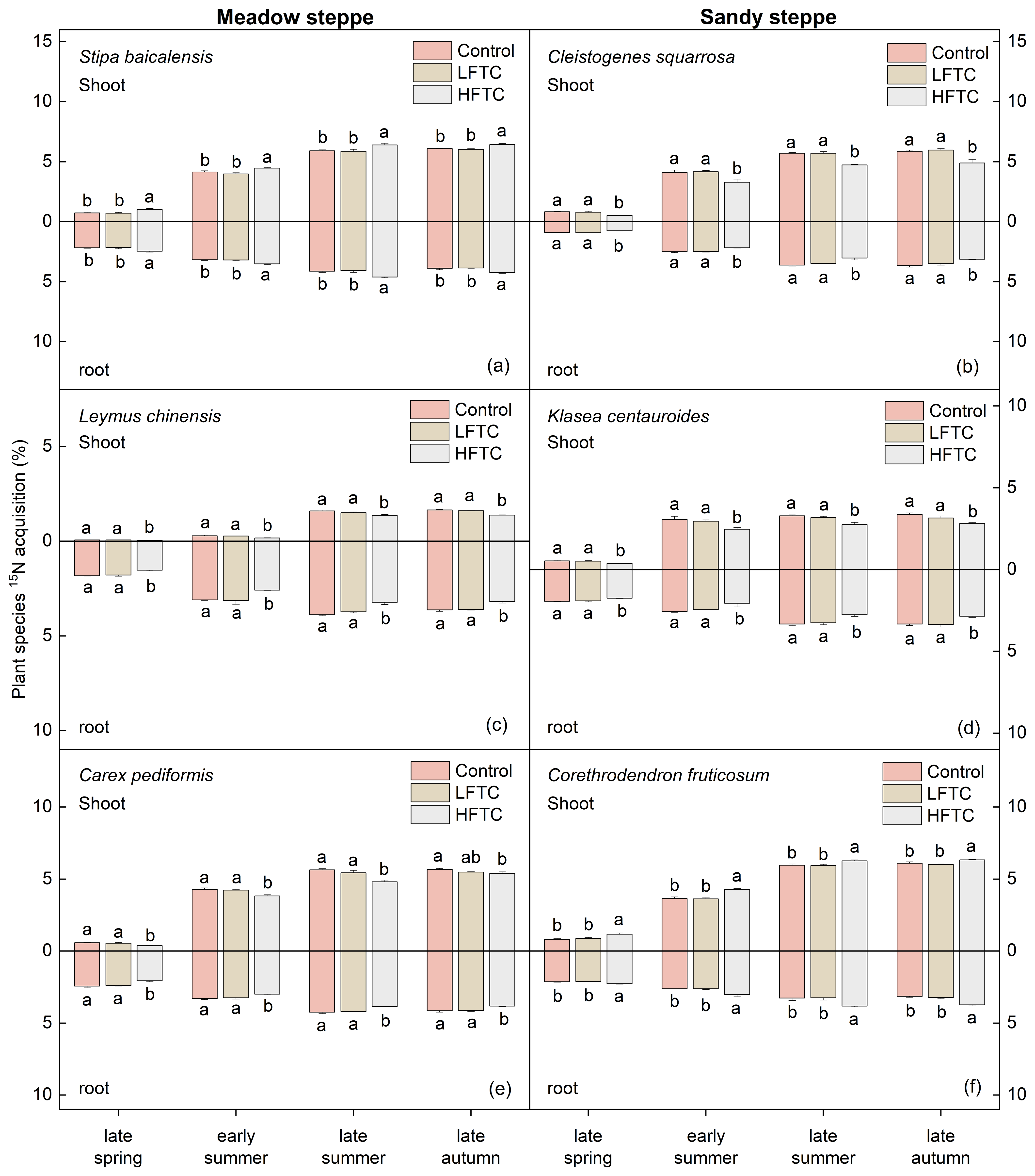 Figure 7Plant 15N acquisition under intensified low-frequency freeze-thaw cycles (LFTC; 6 times) and high-frequency freeze-thaw cycles (HFTC; 12 times) treatments in a meadow steppe and a sandy steppe. In the meadow steppe, samplings were collected on 26 March (early spring), 4 May (late spring), 23 June (early summer), 22 July (late summer), and 26 September (late autumn) in 2021. In the sandy steppe, samplings were collected on 5 March (early spring), 29 April (late spring), 21 June (early summer), 26 July (late summer), and 15 October (late autumn) in 2021. Vertical bars indicate the SE of the mean (n=6). Different lowercase letters indicate statistically significant differences among sampling periods (p<0.05).