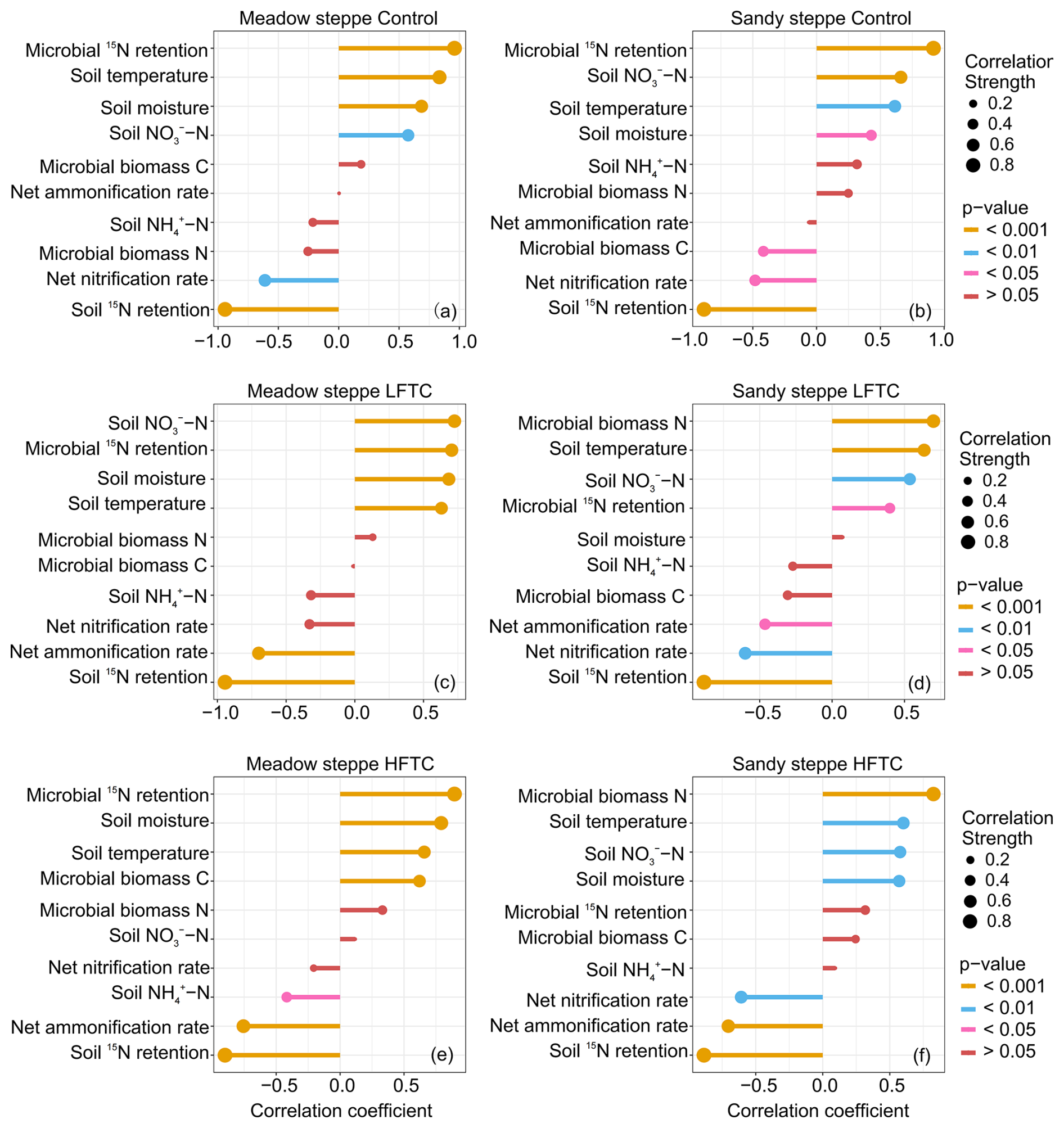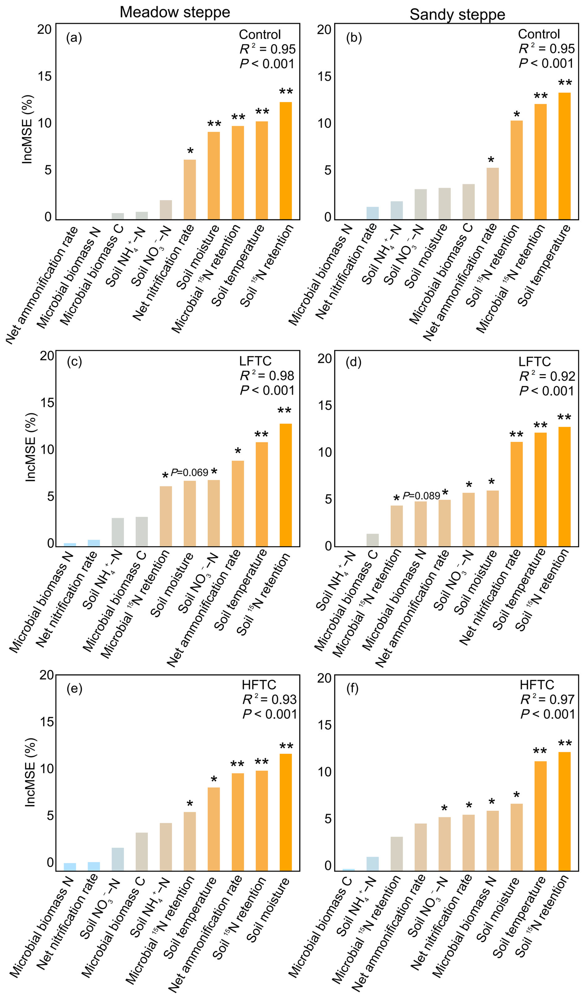 Random forest analysis revealed that soil temperature and soil 15N retention were the primary predictors of plant 15N acquisition across all treatments (Fig. 9). Notably, MBC and NH-N levels did not emerge as a significant predictor in any of the models. However, the importance of other predictors varied between grasslands and treatments. In the meadow steppe, the control, LFTC, and HFTC treatments each retained five key predictors. Dominant predictors under LFTC included net ammonification rate, soil NO-N levels and microbial 15N retention. Under HFTC, key predictors shifted to soil moisture, microbial 15N retention and net ammonification rate. Neither net nitrification rate nor MBN emerged as significant predictors under LFTC or HFTC (Fig. 9c, e). In the sandy steppe, net nitrification rate and soil moisture were key predictors under both LFTC and HFTC (Fig. 9d, f). Both LFTC and HFTC exhibited more predictors than control. Under LFTC, MBN was not a significant predictor (p=0.089), under HFTC, net ammonification rate and microbial 15N retention were also not significant predictors.